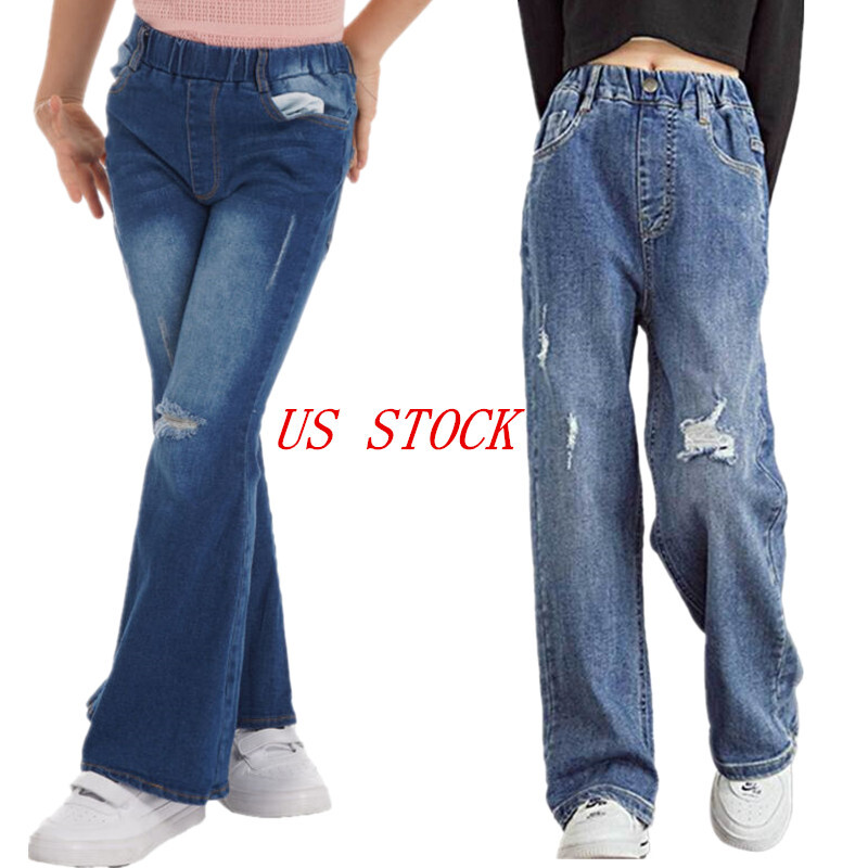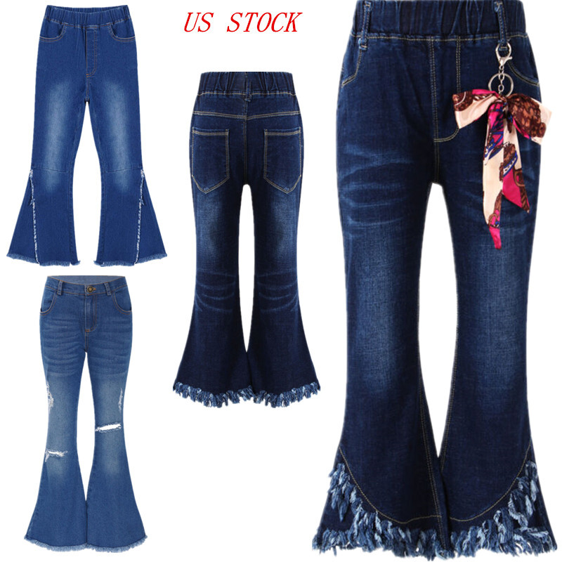 Features with good elastic waistband, button decorated in the front, ruffle under the knee, bell-bottom style denim pants.