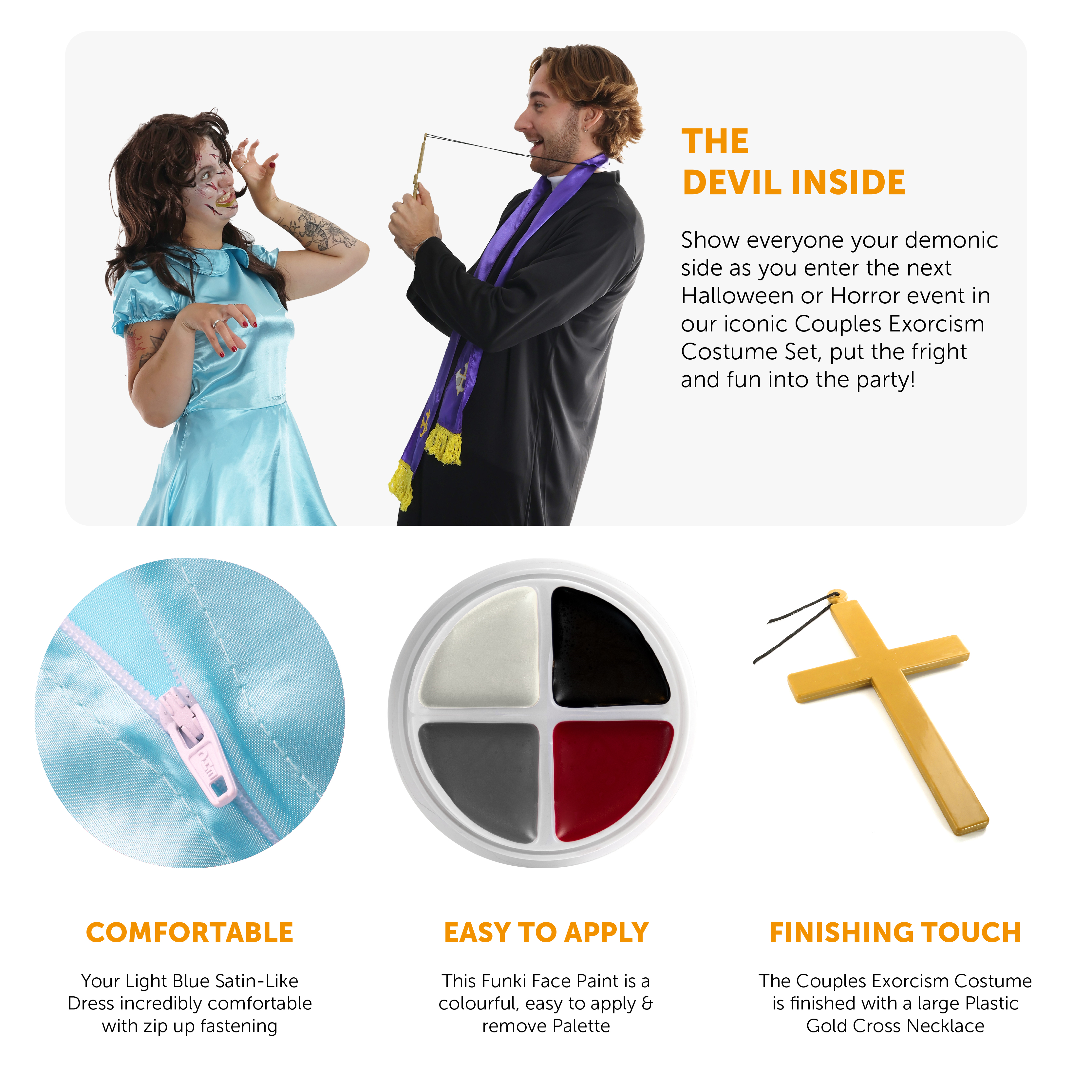 COSTUME DETAILS: This Couples Exorcism Costume Set includes a Long Brown Flick Wig, a Light Blue Dress, a Palette of Funki White, Red, Grey and Black Face Paint with a Tube of Fake Blood, a Black Long Robe with White Collar and a Purple Scarf Vestment with Embroidered Gold Cross, and a Plastic Gold Cross Necklace!