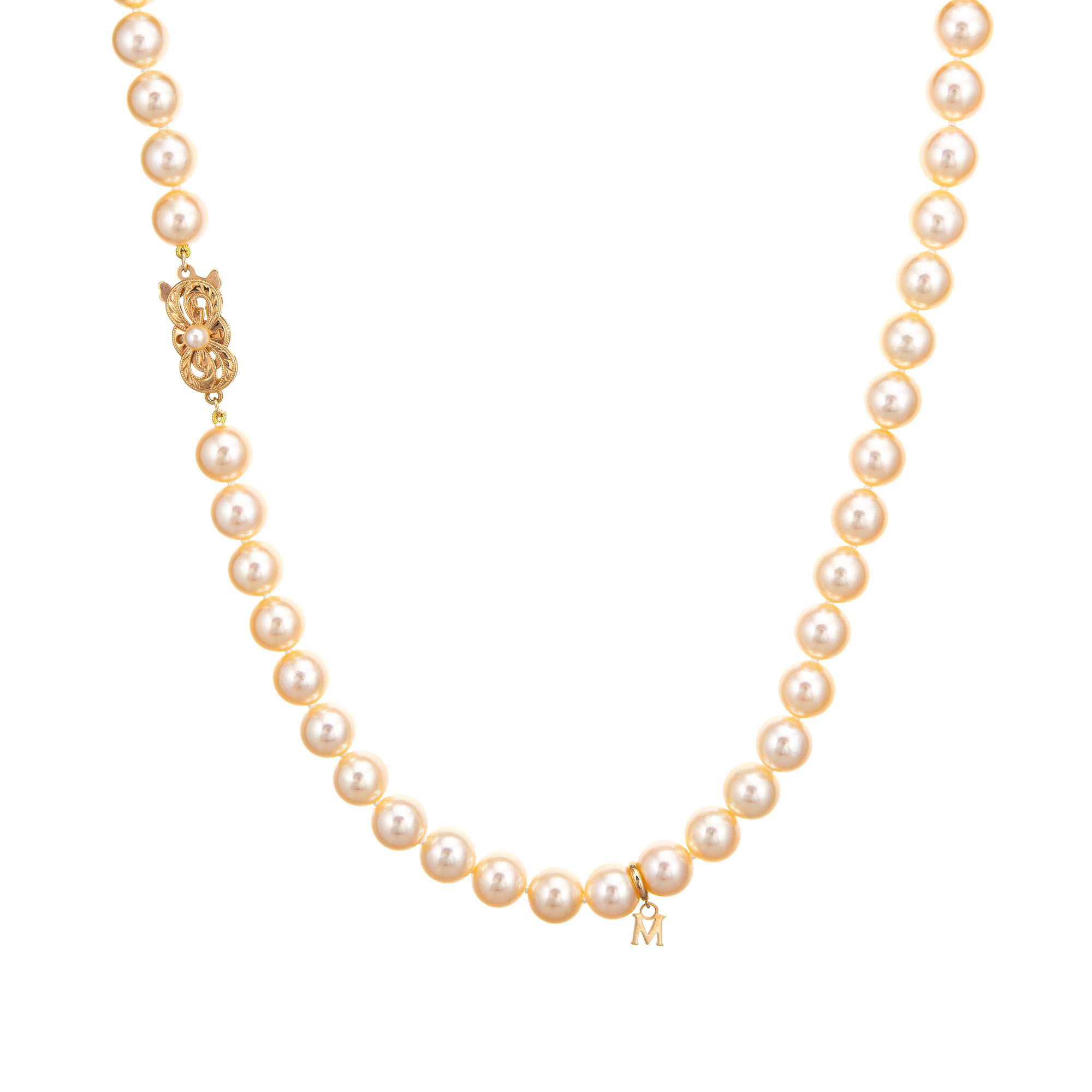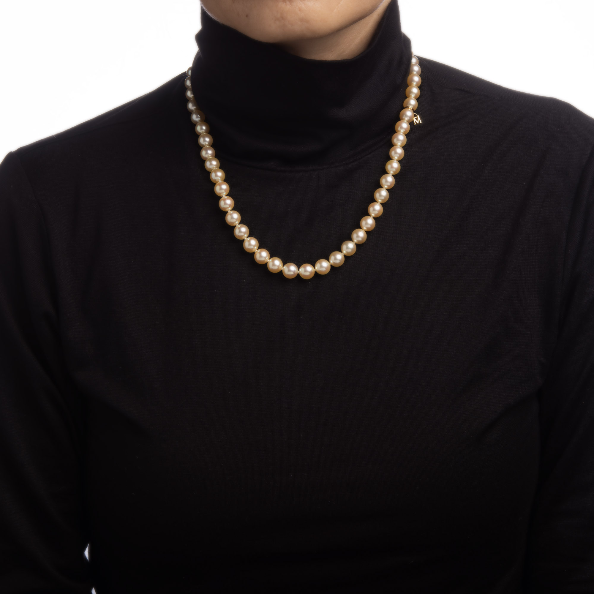 Stones: 8mm cultured Akoya pearls are individually knotted. The pearls are lustrous and show a glossy golden champagne hue.
