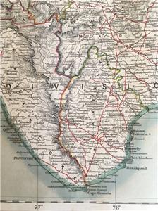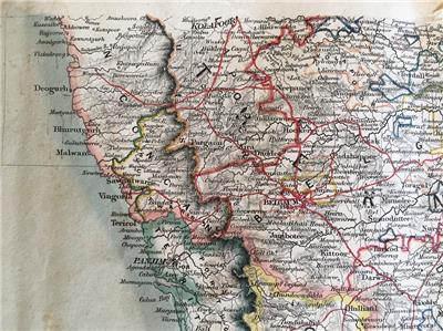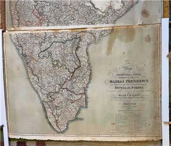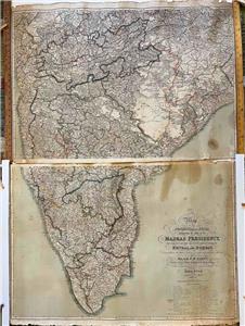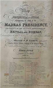 We offer this original 1855 Map of the Peninsula of India, Comprising the whole of the Madras Presidency, and portions of the adjacent territories of Bengal and Bombay. Derived from the latest surveys and other information collected by Major F.H. Scott, The Quarter Master General ot the Madras Army and corresponding in all details with the Road Book Compiled by that officer. Madras, 1855.