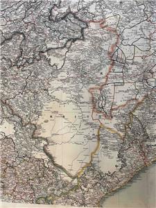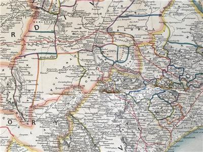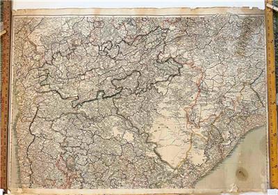 This is a large, hand colored map published in two sections, together measuring 48 x 27 inches (122 x 69 cm). A large and detailed map on a scale of an inch to 24 miles. (Photo of full map is last picture.) Compiled by Scott with assistance from the Grand Trigonometrical Survey of India, the map was drawn up by J.S. Harvey and engraved by J. & C. Walker. Shows mountain ranges, roads and railroads.