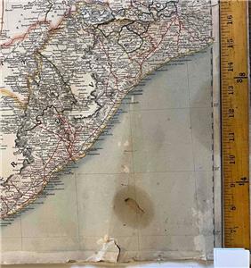 It has been stored loosely rolled in paper. Edges are soiled, chipped with some small closed tears. Long tear and an oily stain in upper right of both sheets. Thus this complete map is in just good condition, needing some conservation. Please look at our pictures for more detail.