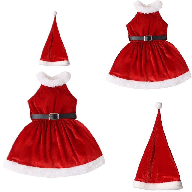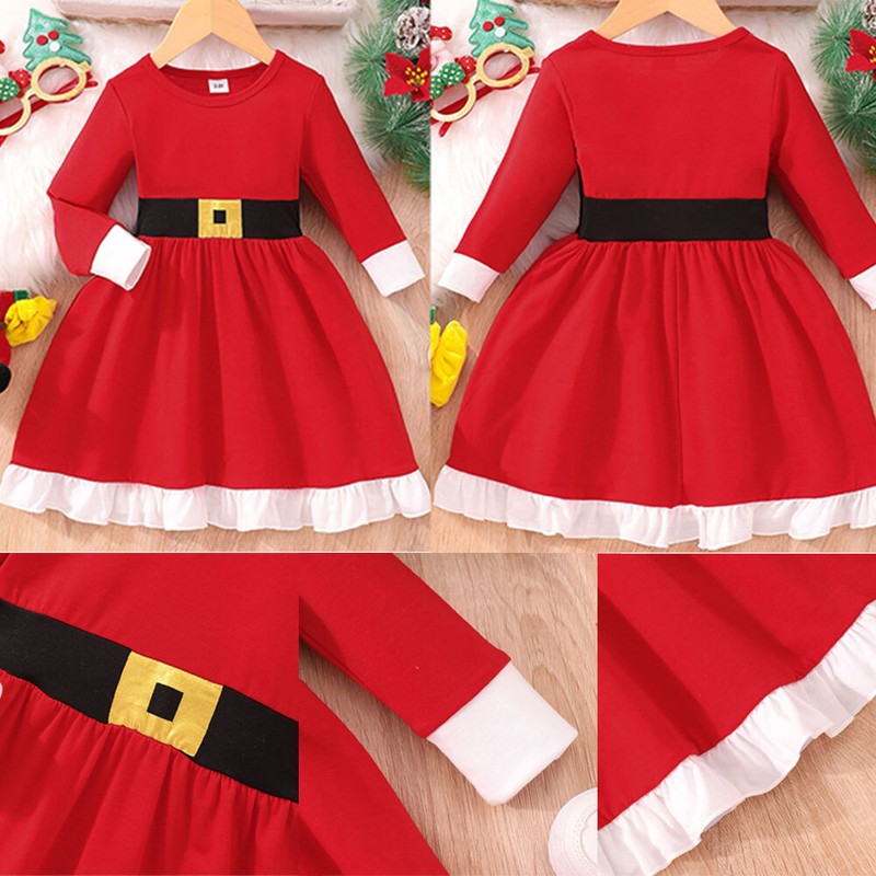 Kids Girls Christmas Velvet Long Sleeves High Waist Belt Faux Fur Trimmed Long Dress.