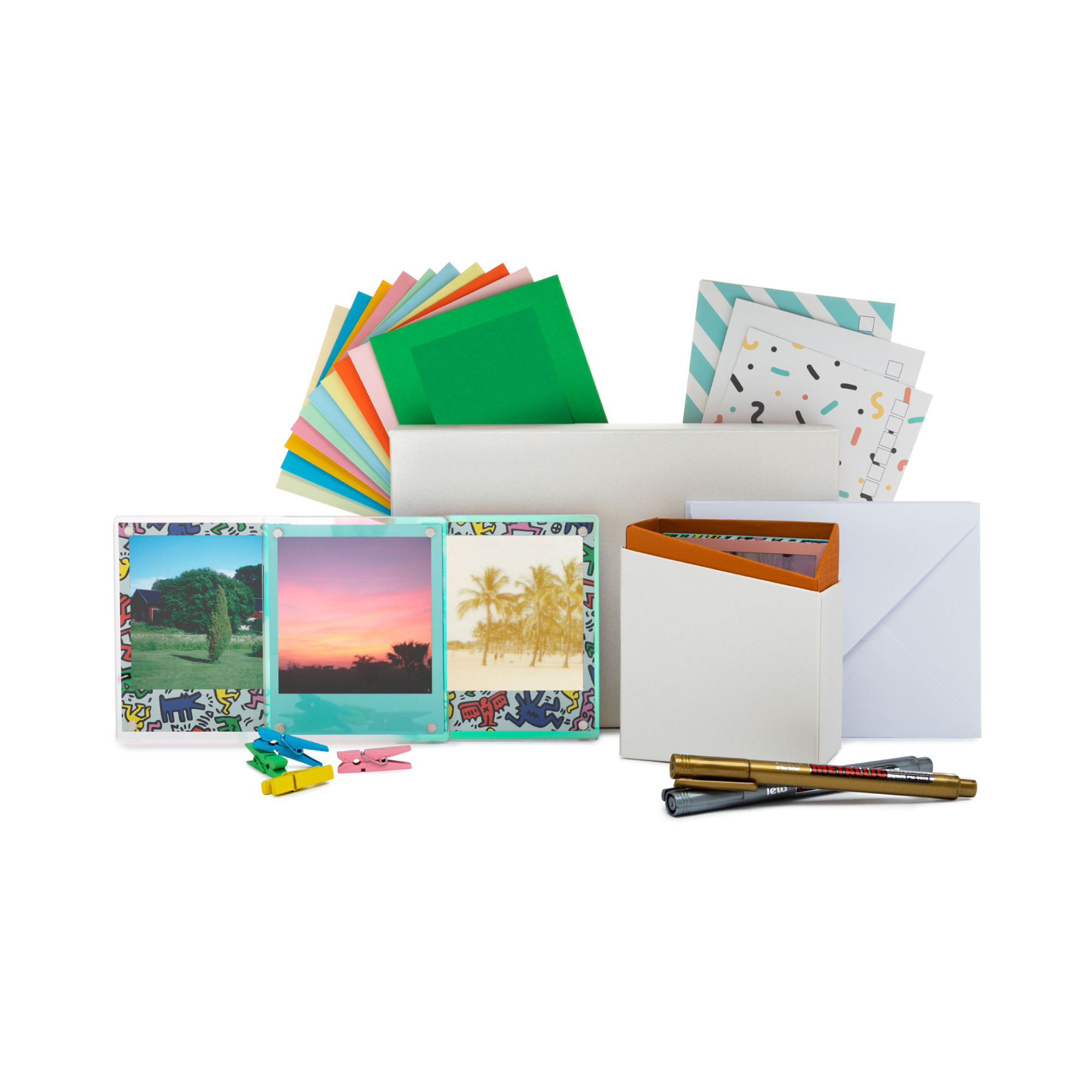 Store and display your instant photos in style with the Focus Camera Polaroid Film Kit for Polaroid i-Type, 600 and SX-70 Cameras. This set provides magnetic and hanging frames, with matching clips, to display your creations. It also includes a standing storage box that holds up to 50 photos.