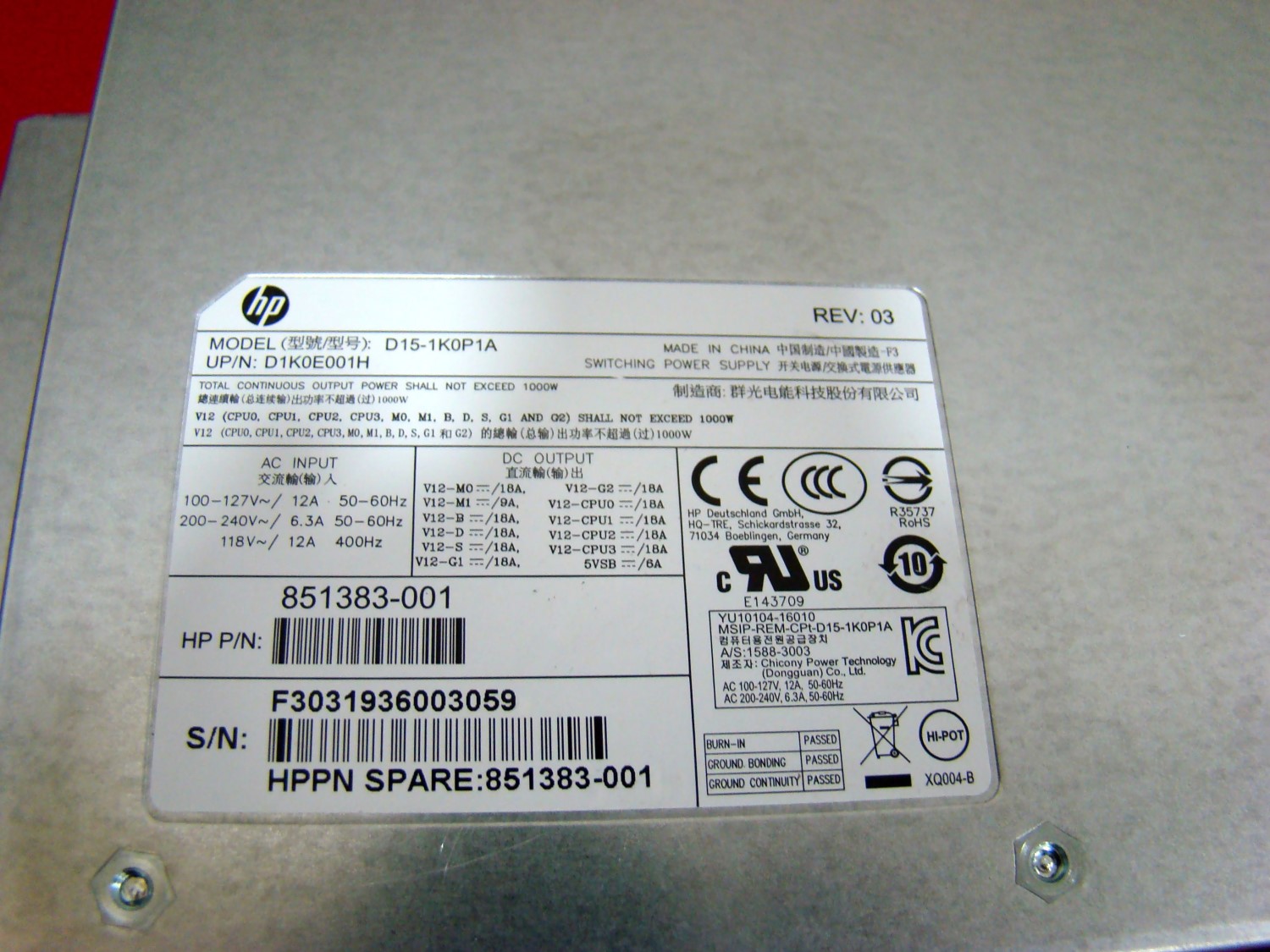 ONE GENUINE HP Workstation Z4 Z6 1000W Power Supply D15-1K0P1A 851383-001