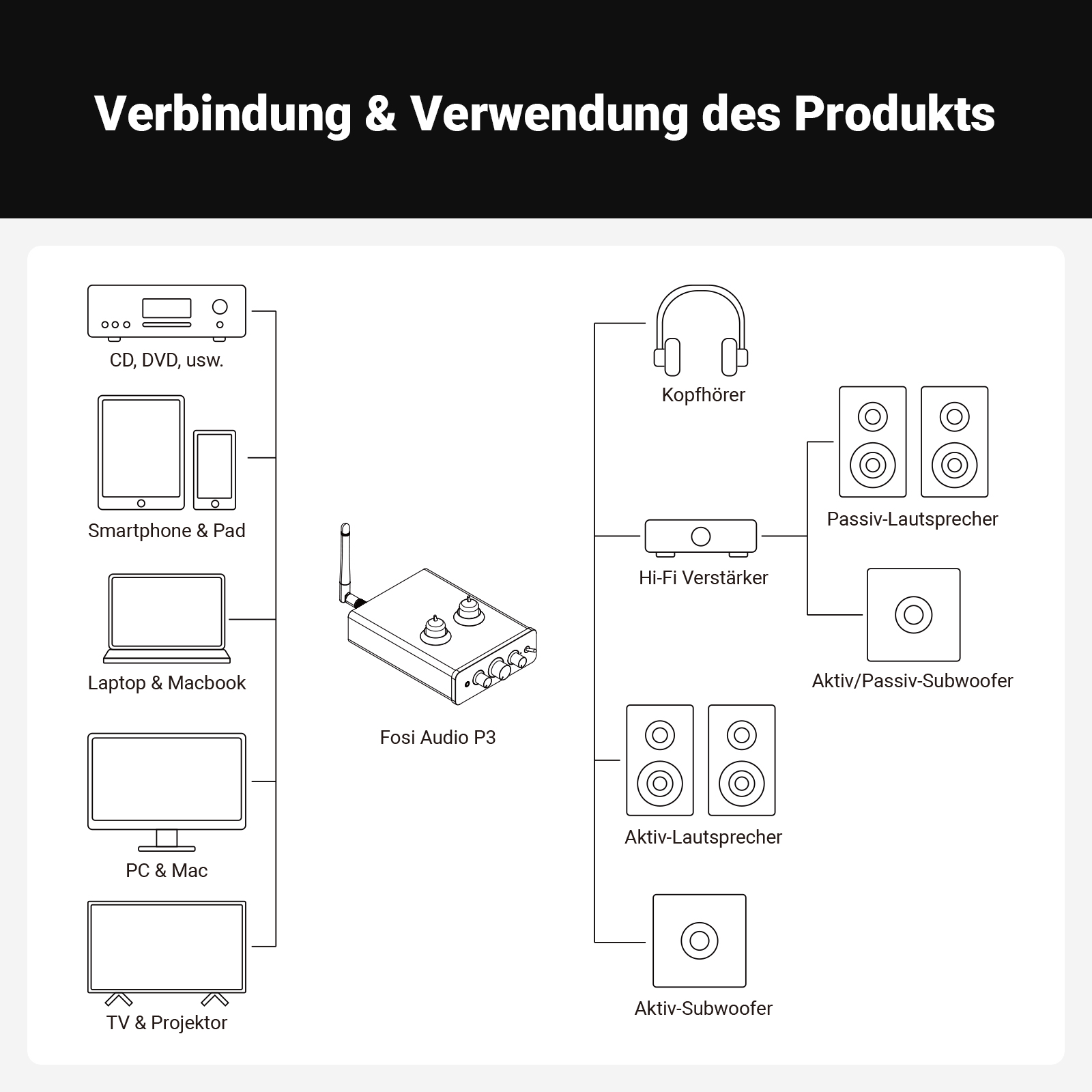 HINWEIS: Dies ist ein Vorverstärker, kein Leistungsverstärker oder Phono-Vorverstärker. Er kann nicht für Plattenspieler oder passive Lautsprecher verwendet werden.
