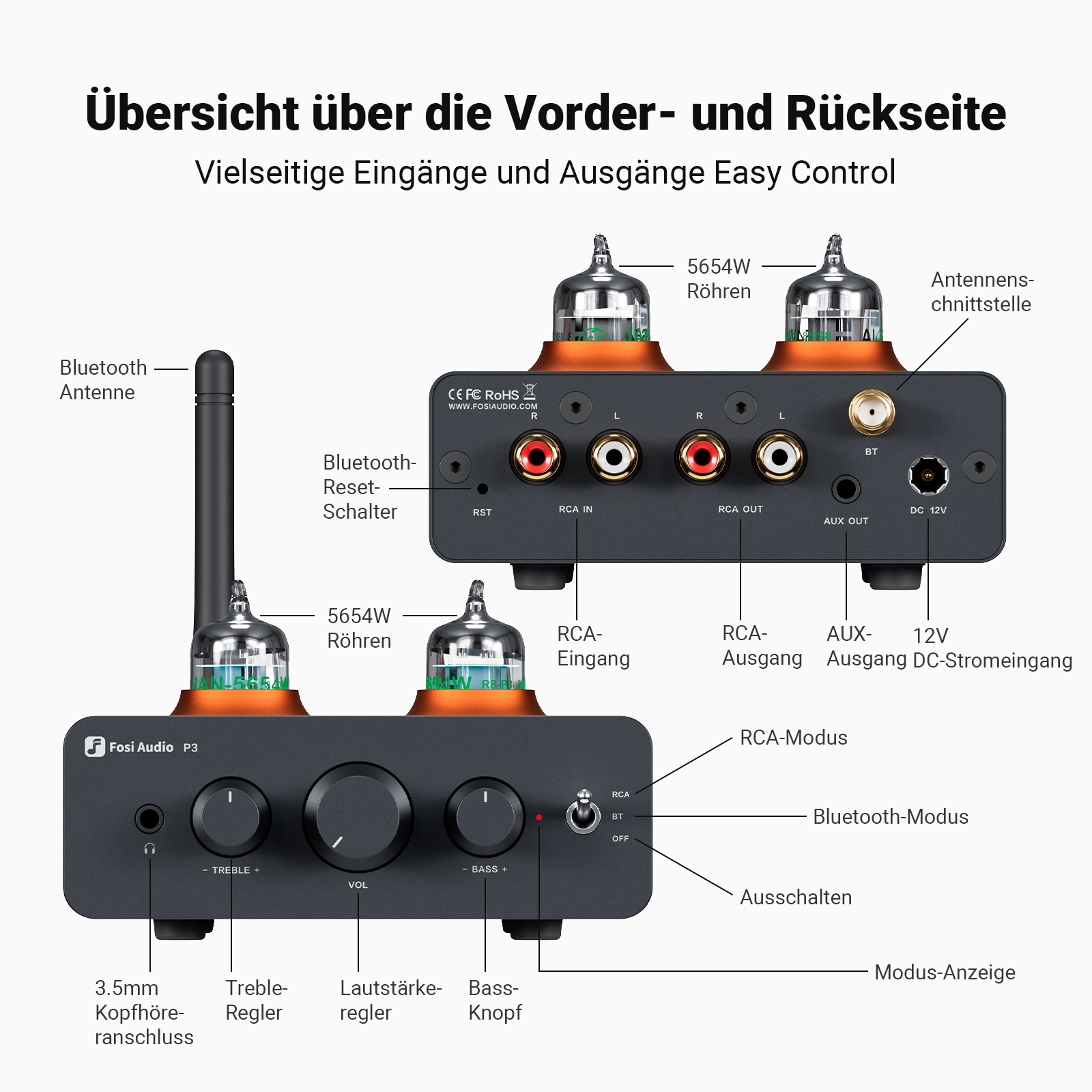 Fosi Audio P3 Bluetooth-Röhrenverstärker, HiFi-Stereo-Vorverstärker, Ventilvakuum mit Höhen- und Basstonregelung für Heimlautsprecher