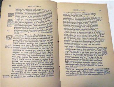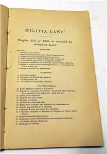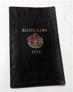 The book was published in 1872 and contains the laws that were in effect at the time for the Massachusetts militia. Good condition. The laws are divided into four parts: