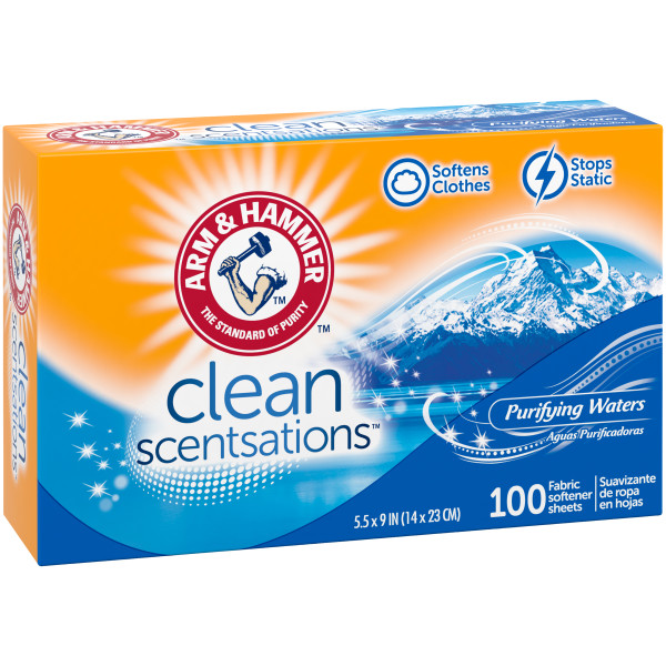 Add freshness and softness to your laundry with ARM & HAMMER Fabric Softener Sheets with a clean scent inspired by nature. Bullet Feature 1* Softens clothes Bullet Feature 2* Reduces static cling Bullet Feature 3* Great Fragrances Bullet Feature 4* Scent: Purifying Waters Bullet Feature 5* 100 sheets. Usage: Place a new sheet on top of wet clothes in dryer. For large loads or extra softness use two sheets. For synthetics use low heat. If spotting occurs, wet and rub spot with bar soap and rewash. Safe for all washables. Indications for Use* Place a new sheet on top of wet clothes in dryer.