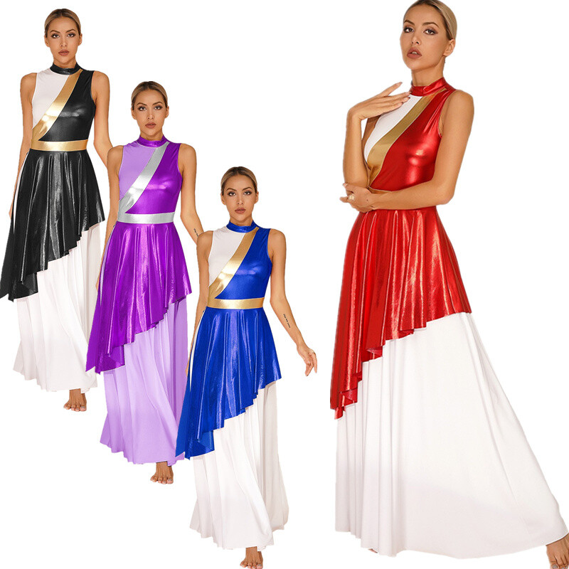 Adopted with stripe and chessboard elements, shiny mesh layer patchwork on sleeves and skirt.