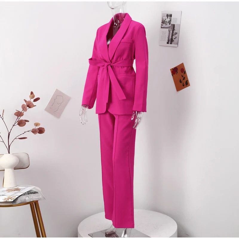 Fashion Lace Up Blazer Long Pant Sets Women V-Neck Blazer with Belt Outfits