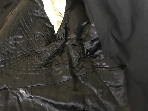 Open collar, one front button, long vent at the back and lined with soft silk satin. With strengthening quilting around the armholes, a sign of quality.
