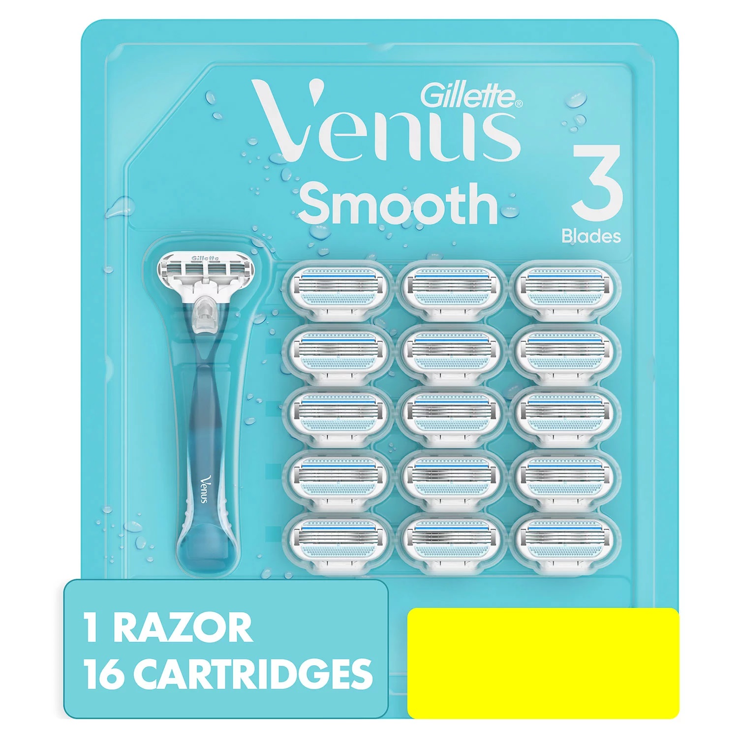 Get smoother than ever with Gillette Venus Original Women's Razor (1 Handle + 16 cartridges). Gillette women's razors have a special triple bladed design that is made specifically for women and their skin. The Venus razor contours to every curve for the closest shave a woman can get - all with a single stroke. This package comes with 16 cartridges to last long after the first shave. This item is NEW.