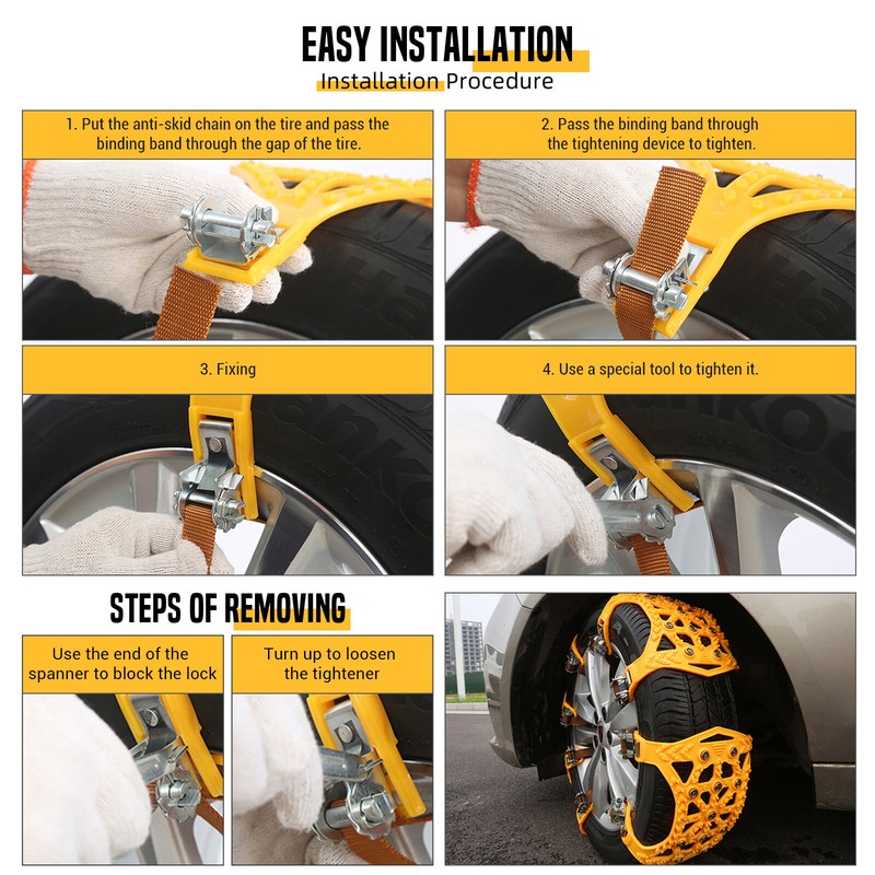 The snow chains are designed to increase your car's working abality on a snowy, rainy, sunny day, safely run on snow roads, mud roads, sand roads, mountain roads, rain roads and all kinds of terrain.