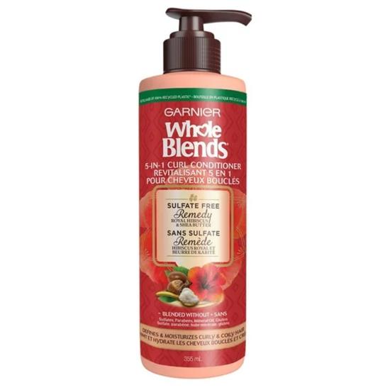 Garnier Whole Blends 5 in 1 Curl Conditioner with Royal Hibiscus Shea Butter, Garnier Whole Blends Sulfate Free Remedy Hibiscus and Shea Moisturizing Daily Conditioner, Sulfate Free Remedy Royal Hibiscus Shea Butter 5-in-1 Curl Conditioner. our potent, yet gentle remedy for curls and coils expertly blends hibiscus flower and sustainably sourced Shea butter in powerful, deeply moisturizing, Sulfate-free recipes. Curls Coils Regimen. our regimen of shampoo and 5-in-1 conditioner moisturizes and defines curls. Helps combat dryness shapelessness, curl-by-curl. Protects hair against the damaging effects caused by heat and styling.