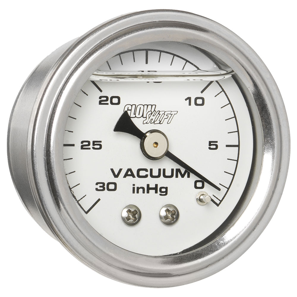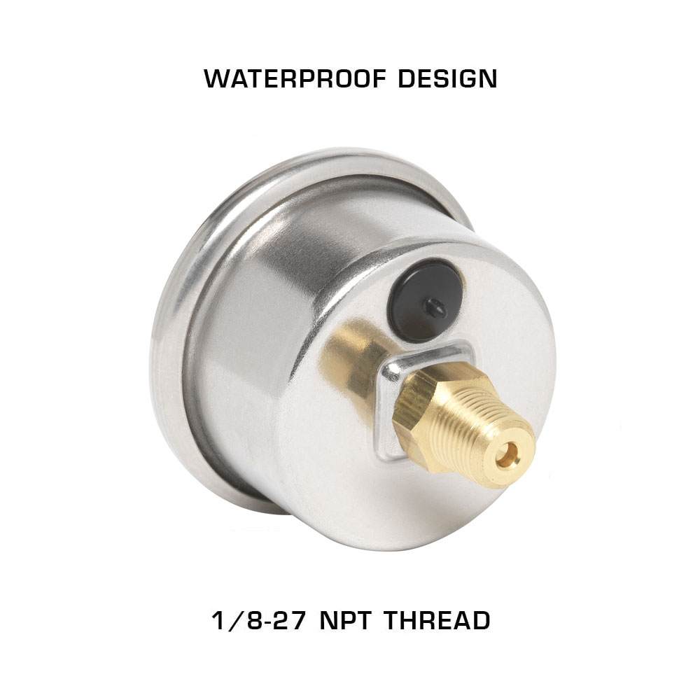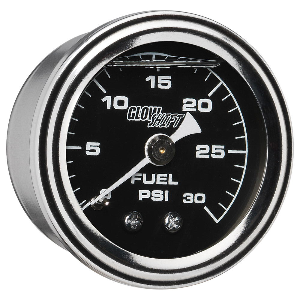 GlowShifts Liquid Filled Black Mechanical Series Gauges are designed with an analog display featuring a black gauge face, white needle and clear lens. Each 1-1/2 (38mm) gauge is liquid filled with silicone oil to help protect the needle from powerful engine vibrations so you can receive readings with pinpoint accuracy. Housed in a waterproof chrome body with a trim ring, this mechanical liquid filled fuel pressure gauge is built to last and will enhance the look of your car or truck.