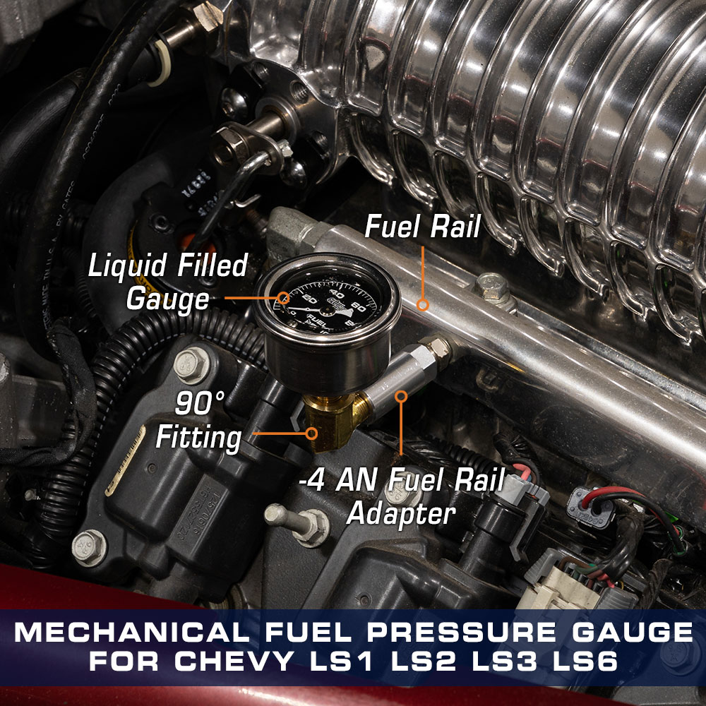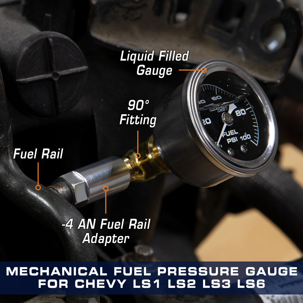 GlowShift 1-1/2 (38mm) Black Dial Mechanical Liquid Filled 100 PSI Chevy TBI Fuel Pressure Gauges require no hardware or wiring to display your LS1, LS2, LS3 or LS6 engines fuel pressure levels from 0 to 100 PSI. This analog mechanical GM fuel pressure gauge monitors levels in real time to protect your engine and improve efficiency. A 1/8-27 NPT male thread is located on the back of the gauge that installs into the included Chevy TBI Fuel Pressure Gauge Adapter.