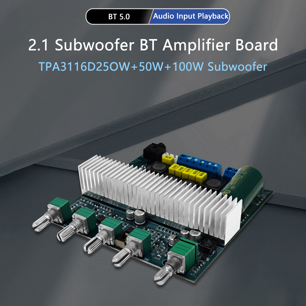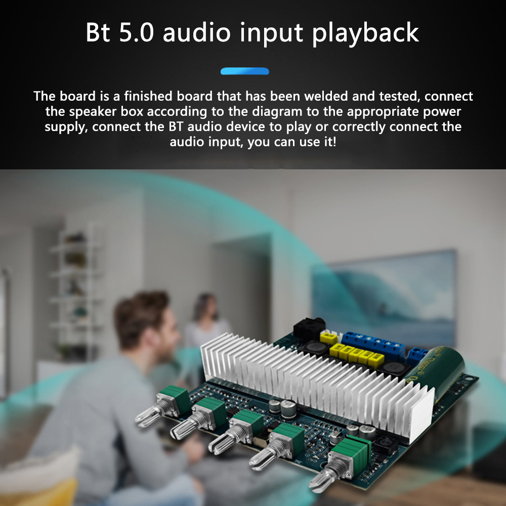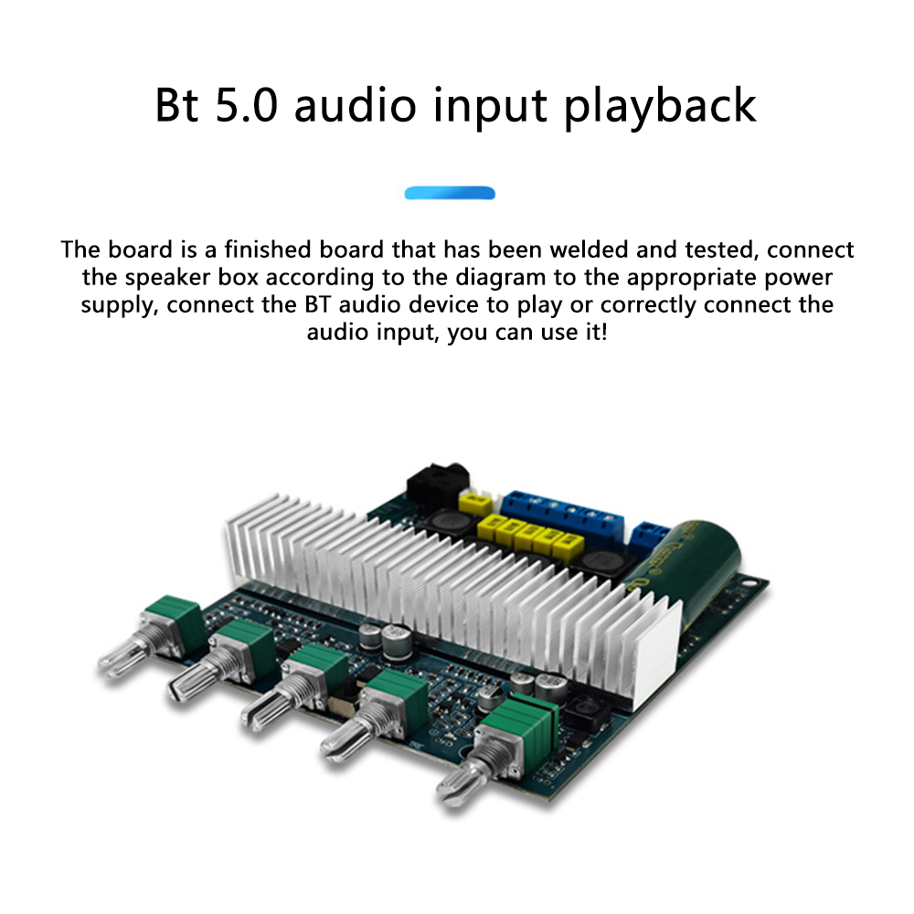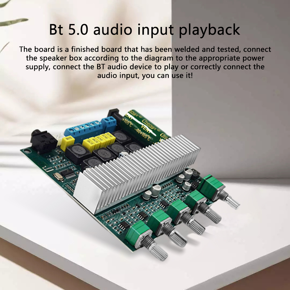 3. Support Bluetooth audio reception, external audio input interface, with preamplification, bass crossover processing; bass volume, bass frequency, left and right channel volume, treble, function control switch/total volume, 5 adjustment potentiometer