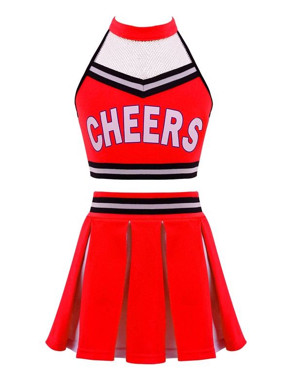 The top features with sleeveless and halter neck with buckle, mesh patchwork style, letter “CHEERS” print in the front, backless design.