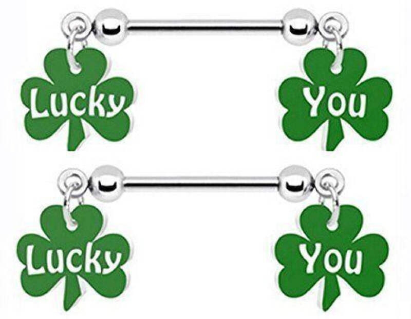 Crafted out of 316L Surgical Steel, this Romantic nipplering is set to make a statement on any occasions. Polished to a brilliant bright smooth finish, this barbell measures 14mm in length, 14 gauge in thickness, and adorned by two Acrylic Shamrocks dangling from each end. Two green shamrocks are connected to the barbell with two rings, so the clovers can be moved freely.