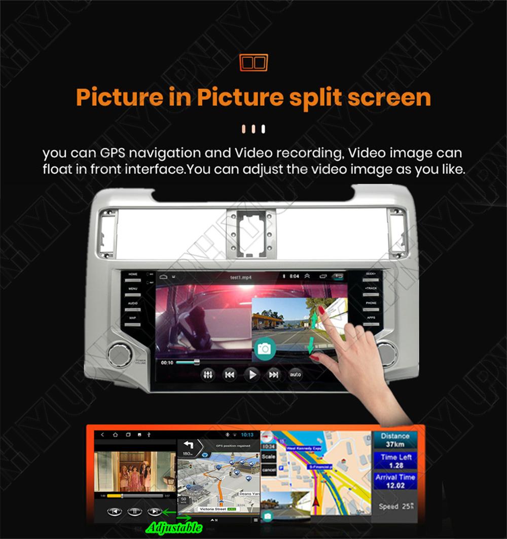 Display | - Touch Screen: Yes - Resolution: 1024*600 - Capacitive or Resistance Screen: Capacitive - Built-in Clock and Calendar: Yes, show real time and can use network-provided time - Main Menu Status Bar display: Can be changed to Music/Radio/BT-Stereo Player and Clock/Date/Week - Change Apps-Icon Position: Yes - Picture in picture split screen:Yes Split screen feature enables you to use two applications at the same time. For example running Navigation with Music Player or Radio with Navigation at the same time. Optimum convenience for both the driver and passengers. |
