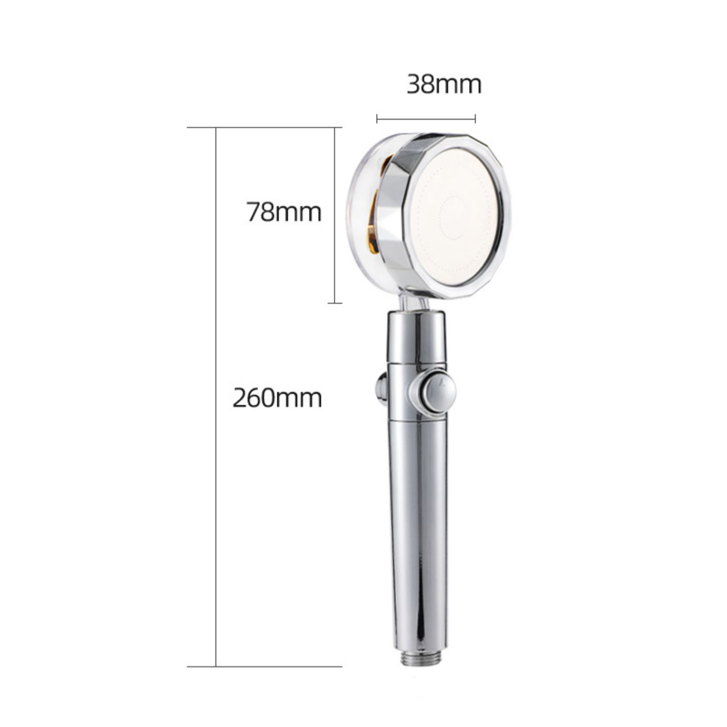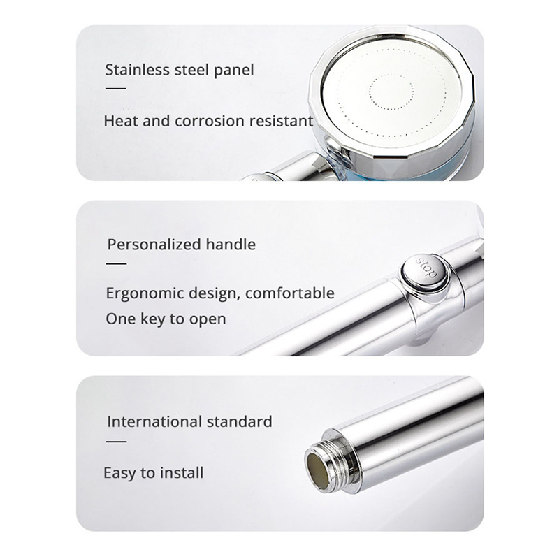 Description: 【High Pressure Design】Shower head makes water flow generates a pressurized flow through the rotating wheel, increasing the speed of the water flow, thereby increasing the water pressure.Apply to low water pressure. 【Water Saving】Shower head uses micro nozzle technology makes the outlet holes smaller and denser, increasing the speed of the water flow, At the same time Up to 40% water saving than ordinary shower head. 【ON/OFF Switch】Shower head have a ON/OFF Switch. Just press the switch on the nozzle handle to stop the water flow at any time.【Easy to Uses】Handheld shower head adopts G1/2 international standard interface, suitable for most hoses and brackets or shower attachment arms, It can be installed by itself without the use of plumbers and tools. Specification Material:ABS Plastic + 304 Stainless Steel Product Net-Weight:140 g Water Inlet:4 points water inlet Product Process:Plating Package: 1x Pressurized Shower Head Note Due to manual measurements, please allow slight measurement deviations. Due to the different display and lighting effects, the actual color of the item may be slightly different from the color displayed on the picture. If there is water leakage, please re-install the silicone gasket and other parts, and it will be used perfectly.