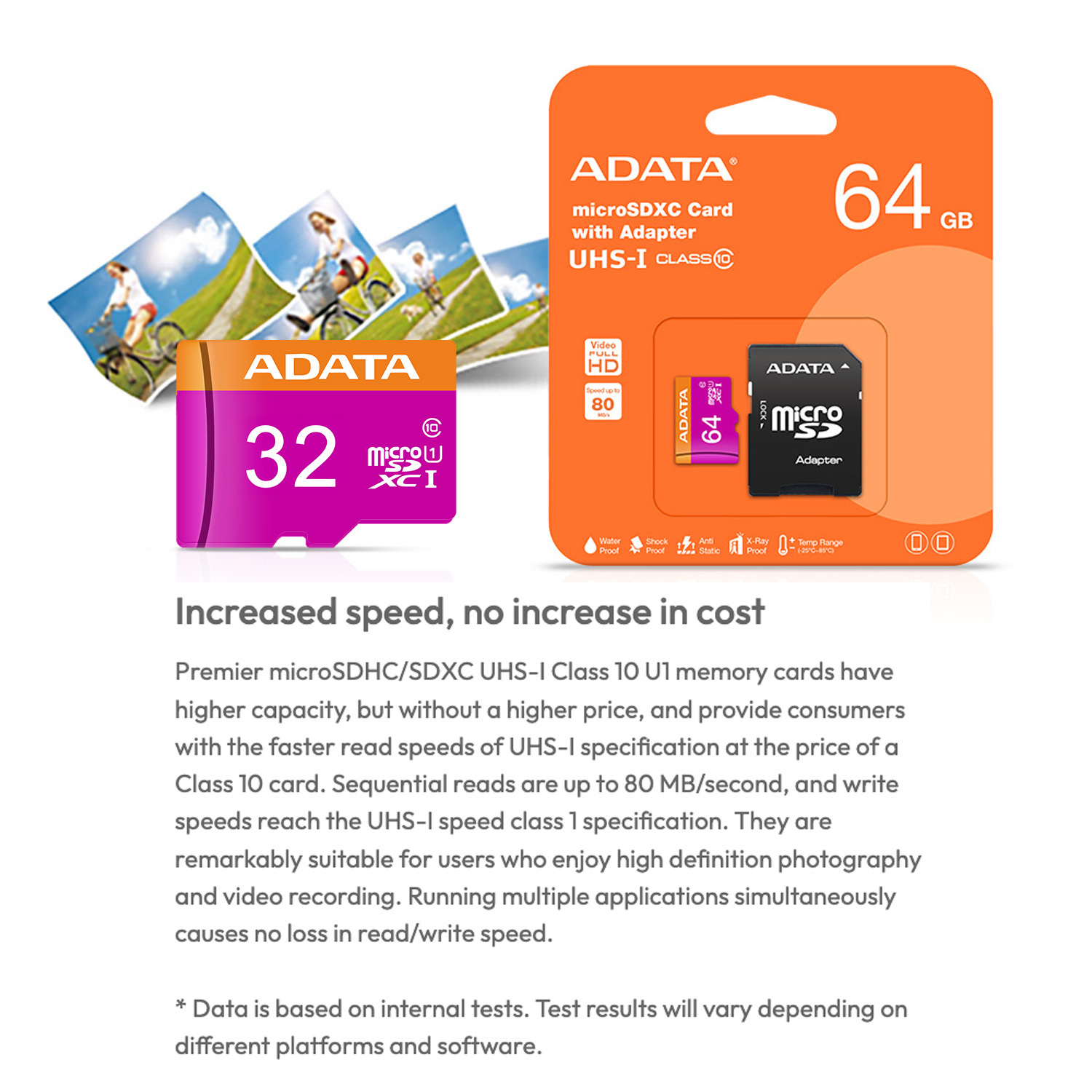 Premier MicroSDHC UHS-I Class 10 U1 memory cards have higher capacity but without a higher price and provide consumers with the faster read speeds of UHS-I specification at the price of a Class 10 card. Sequential reads up to 80 MB per second and 10 MBPS write speed reach the UHS-I speed class 1 specification. It is remarkably suitable for users who enjoy high-definition photography and video recording. Running multiple applications simultaneously causes no loss in read and write speed.