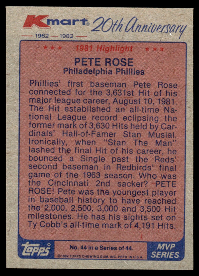 | 1982 Topps Kmart 20th Anniversary PETE ROSE #44 Phillies Highlight | ||||||||||||||||||