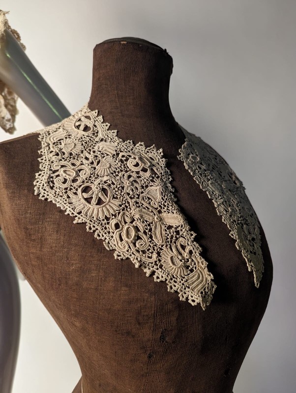 FASHIONED OF A LIGHT ECRU HAND MADE IRISH CROCHET LACE THAT IS A COTTON SILK BLEND.