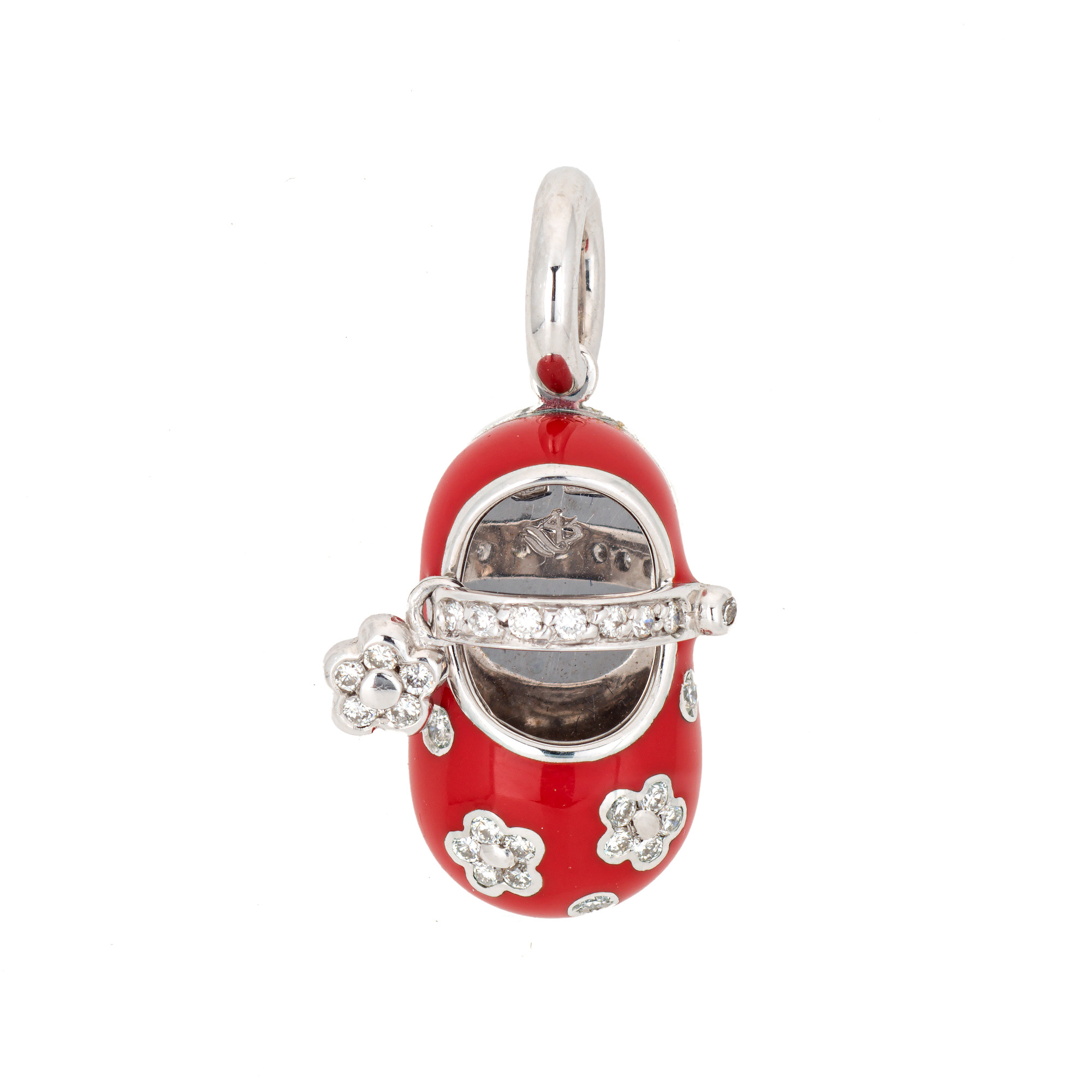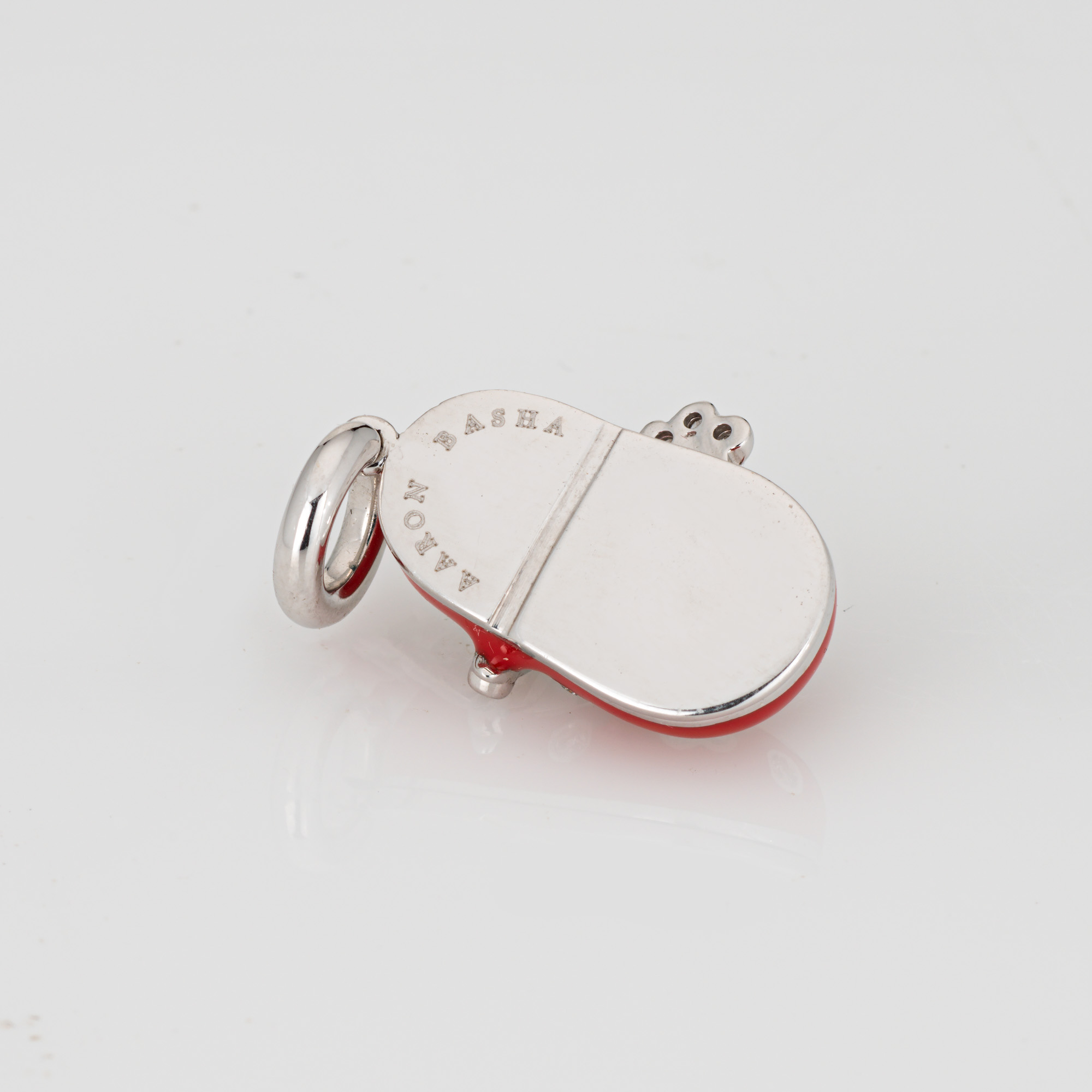 Overview: Finely detailed pre-owned Aaron Basha red enamel diamond flower shoe charm crafted in 18k white gold. Round brilliant cut diamonds are pave set into the shoe and total an estimated 0.26 carats (estimated at H-I color and VS2-SI1 clarity).