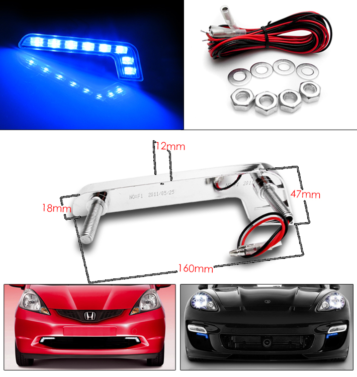 | Highlights | Latest LED design to provide superior lighting and ensure a pleasurable and comfortable driving experience DRL Bumper Lights Specification: Color: Blue LED Dimension: 160mm(L) x 12mm(W) x 47mm(H) Voltage: DC 12V Working current: 0.5A Color temperature: 8000K Power: 0.06W Per LED Brightness: 90 LM With reverse polarity protection and open circuit protection |