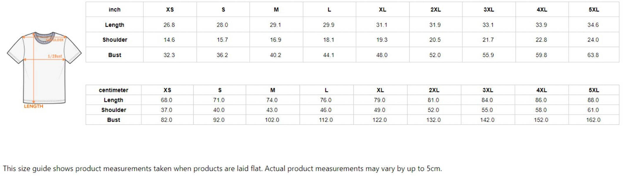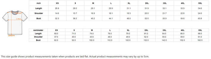 | centimeter | XS | S | M | L | XL | 2XL | 3XL | 4XL | 5XL |