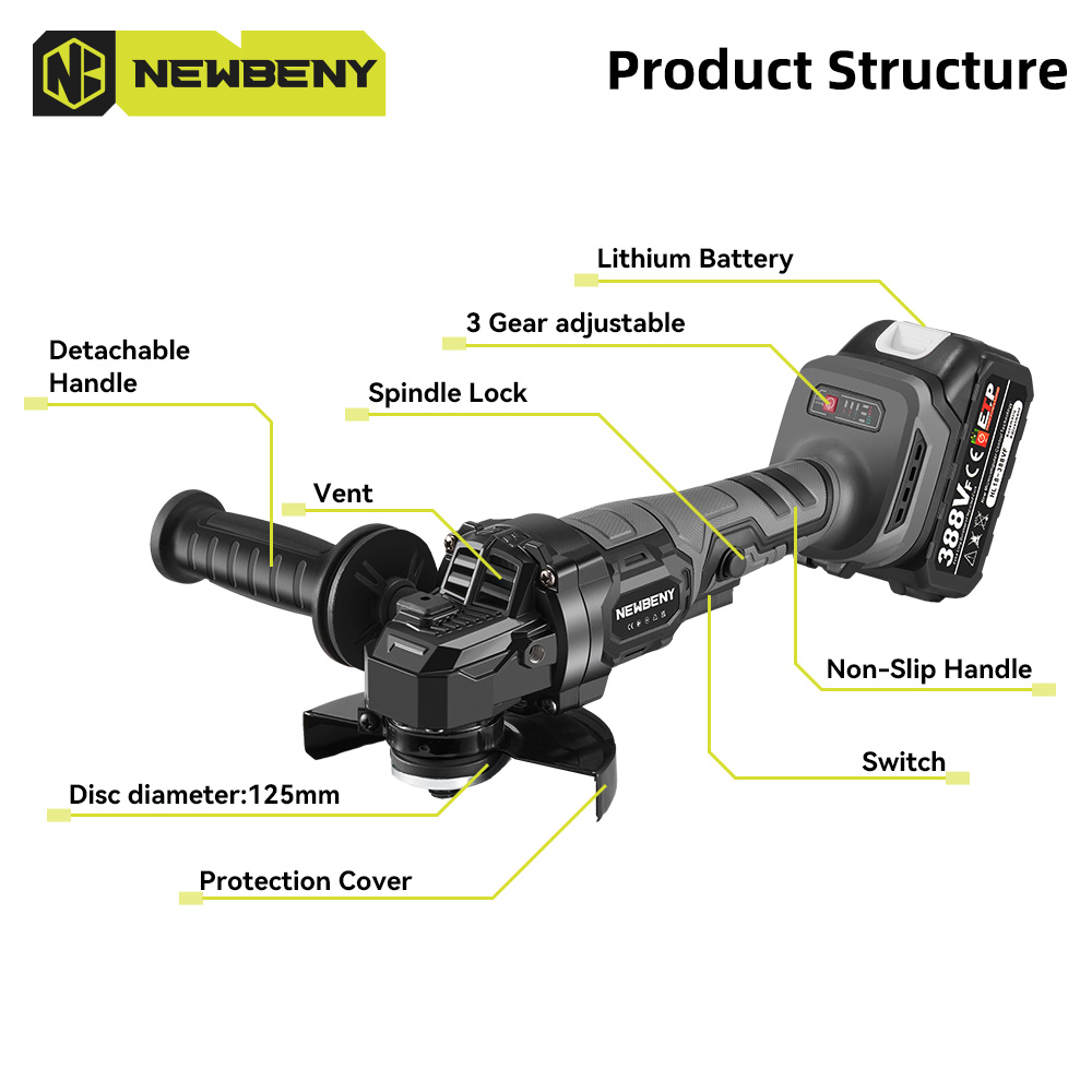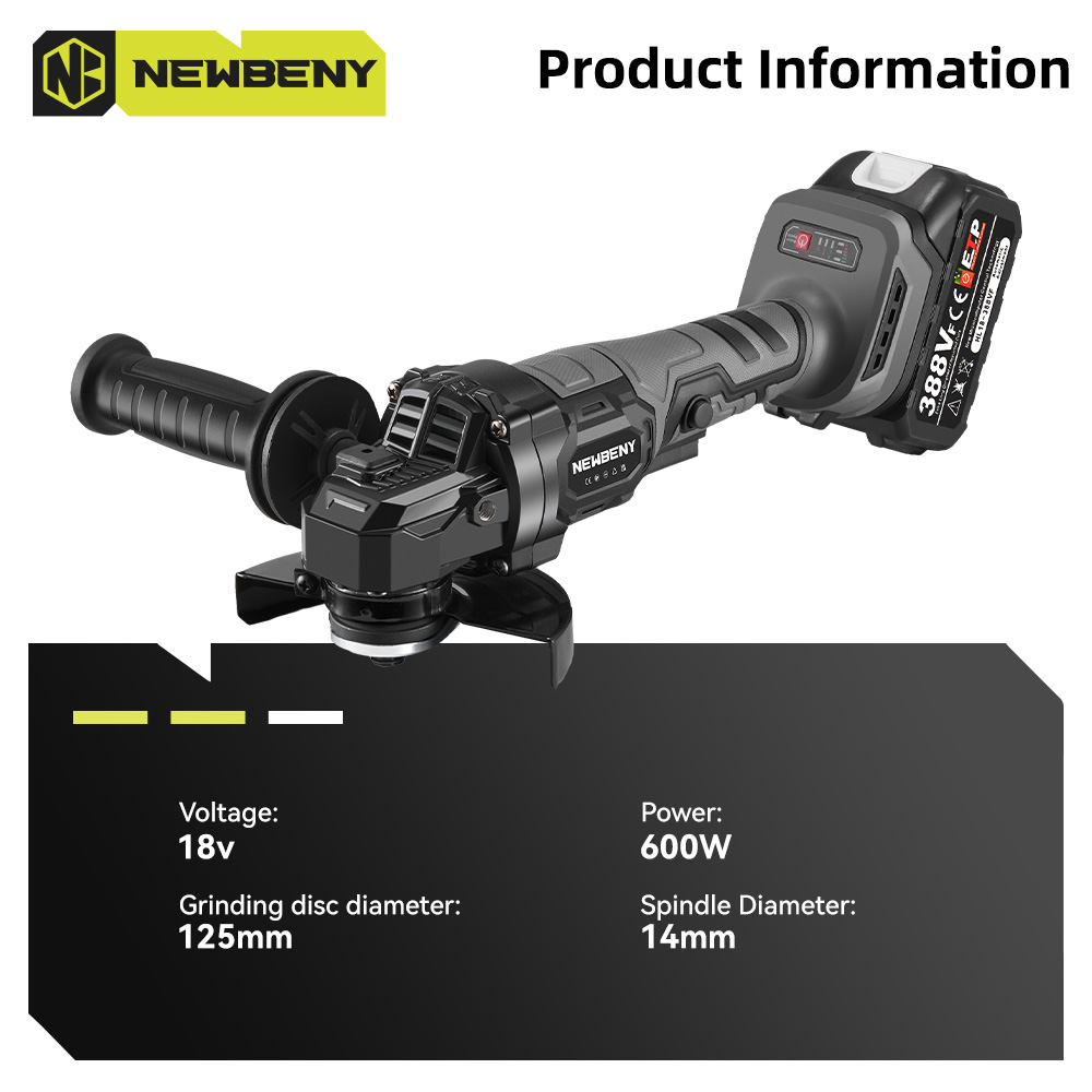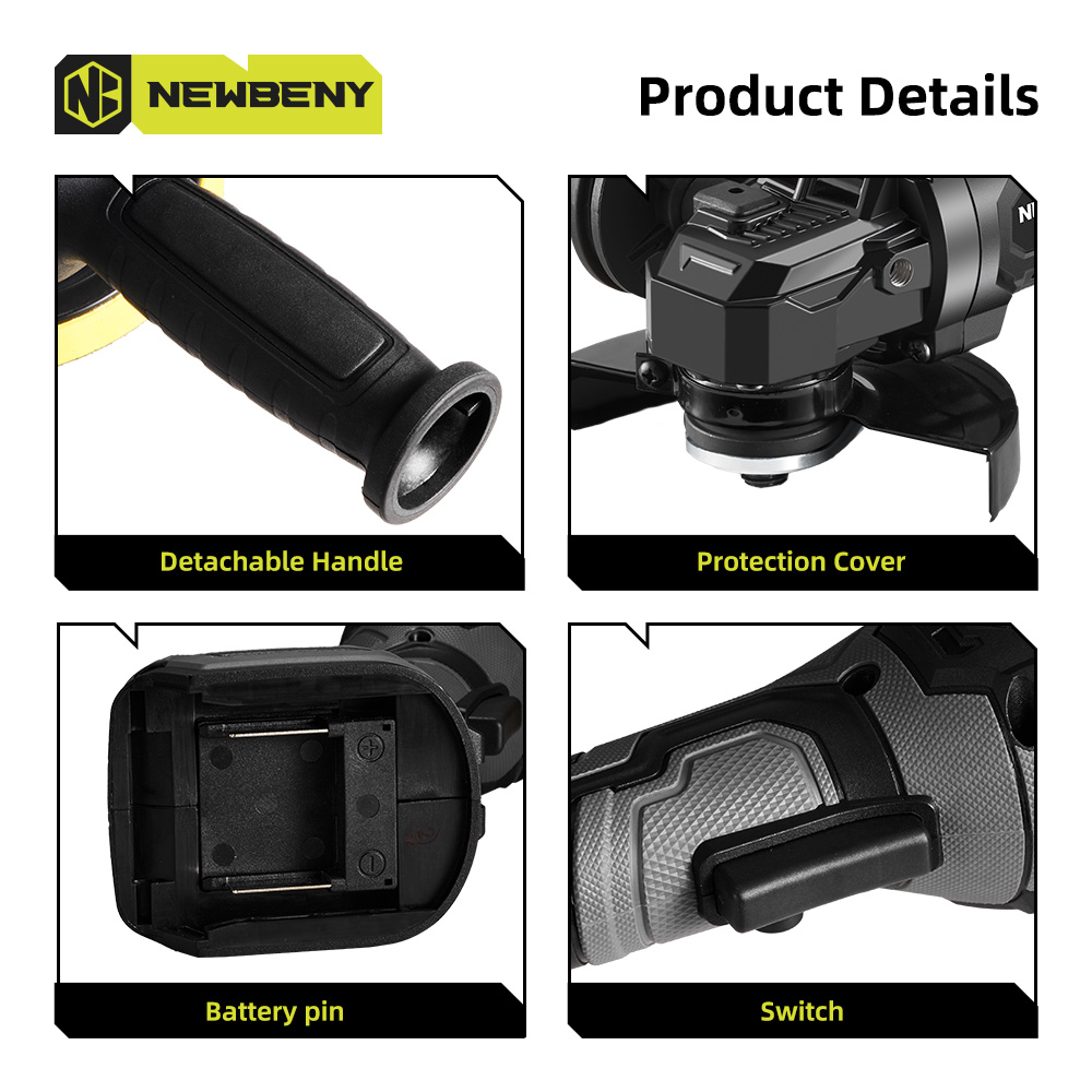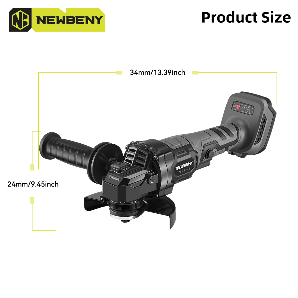 Caratteristiche: - Motore brushless, elevata potenza di uscita, sicuro ed efficiente. - Pannello di visualizzazione intelligente, indicatore di potenza. - 3 impostazioni di velocità per la velocità desiderata. - Pulsante di blocco di sicurezza, per proteggere la sicurezza dell'utente. - Blocco del mandrino per la sostituzione del disco. - Coperchio di protezione per evitare la fuoriuscita di trucioli e scintille durante il lavoro. - Impugnatura ausiliaria rimovibile per facilitare l'uso. - Impugnatura gommata e antiscivolo per una presa confortevole. - Con fori di dissipazione del calore per una rapida ventilazione, per garantire un uso efficiente della macchina e prolungarne la durata.