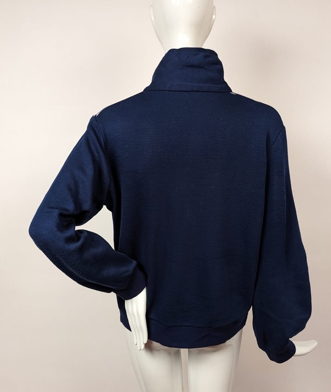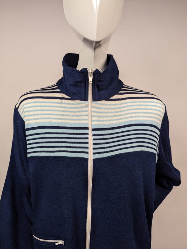 FASHIONED OF A NAVY BLUE ACRYLIC POLY FABRIC WITH STRIPED TOP. ANGLED POCKET ON RIGHT SIDE, CLOSES WITH A PLASTIC ZIPPER WITH A METAL PULL TAB AND MATCHING ZIPPER UP THE FRONT.