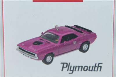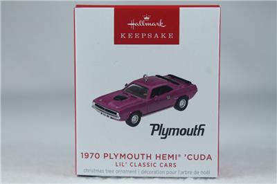 This is an exquisite 2023 Ornament. It is titled '1970 Plymouth Hemi 'Cuda' from the Mini or Miniatrue collection of ornaments. This is the 6th in the Lil' Classic Cars Series. A great ornament. This would make a great addition for any Hallmark collection or as a gift.