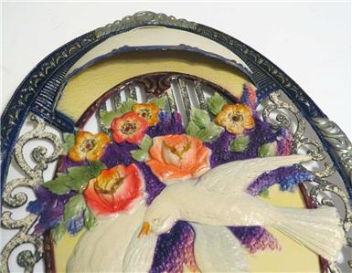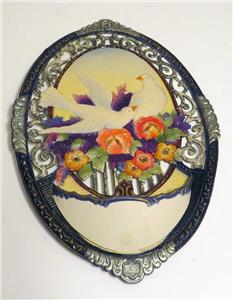1950S VALENTINES DAY DIE CUT GLITTER EMBOSSED. DOVES IN FLOWERS IN OVAL WALL / WINDOW/ DOOR DISPLAY HOLDER. It measures 18" by 12". Amazing condition, no wear. Made in Germany. Crisp and bright, vibrant colors as seen in the photos. Rare survivor indeed.FLAT RATE S&H $10.