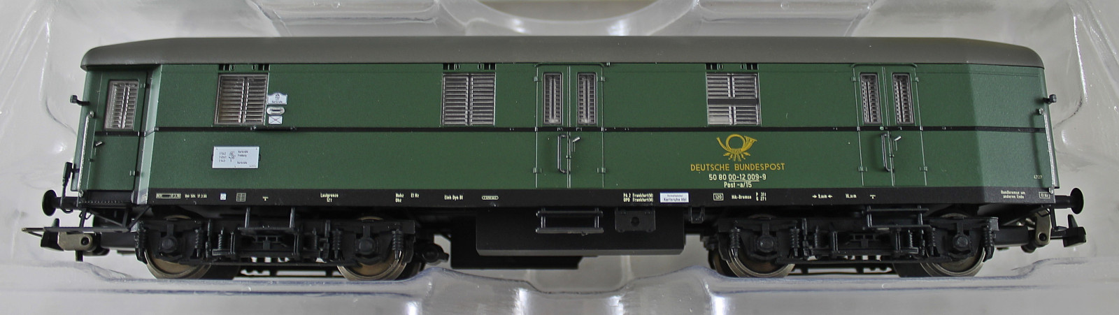 Vorbild: Vierachsiger Bahnpostwagen Post-a/15 der Deutschen Bundespost (DBP) in grün. Betriebsnummer 50 80 00-12 009-9. Sonderserie Deutsche Post