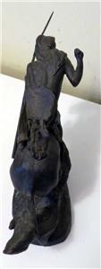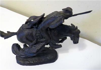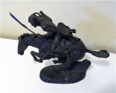 This vintage 1988 Franklin Mint bronze sculpture, titled "The Cheyenne," is a masterpiece by the renowned sculptor Frederic Remington. Measuring approximately 8" long (from nose to tail) and 6.75" tall, it is crafted from bronze and features a facsimile signature of the artist (Frederic Remington) on the top edge of the base. Additionally, it bears a label on the bottom indicating it was crafted in Thailand.