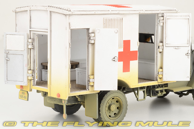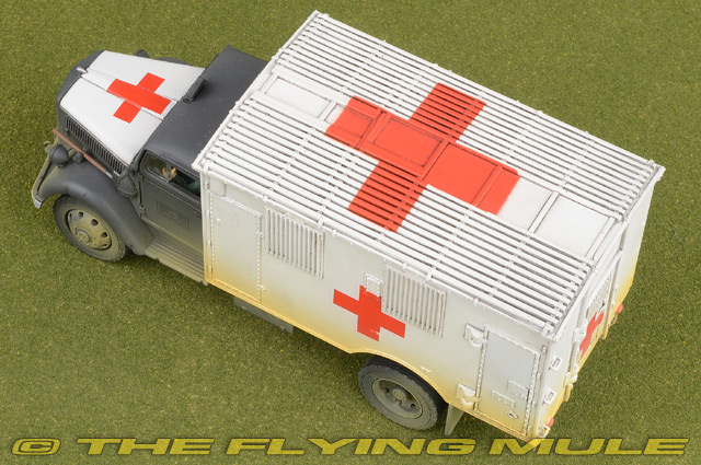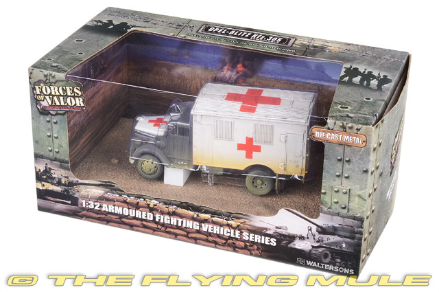 The German 3-Ton Cargo Truck was the workhorse of the German Army, with nearly 140,000 of them produced by Opel, these legendary German light trucks were used extensively throughout Europe from mid 1930s and throughout WWII and beyond. Reliable and easy to repair, the Cargo Truck was a multi-purpose backbone vehicle for the German army that became a beloved symbol of its success. Opel Kfz.305 Blitz AmbulanceDesigned as a series of light and middle-weight trucks for various civilian and military purposes, the Opel Blitz was produced between 1930 and 1975 but is best known for its role in WWII. This 3-ton workhorse served in all German theatres; it carried troops and supplies and was also used as a service vehicle for the Messerschmitt Me 323. This truck's history is somewhat controversial because of the role GM played in its development-at the time, Opel was a subsidiary of the American manufacturer. The Opel Blitz appeared in the film "Raiders of the Lost Ark," and remains one of the symbols of Nazi Germany during the war.© Copyright 2003-2026 The Flying Mule, Inc. Forces of Valor's 1:32 scale Opel Kfz.305 Blitz truck is constructed with a blend of diecast metal and plastic components and is rich in scale detail. The cab is constructed in diecast metal, which provides for most of the model's weight. Side mirrors, headlights and field equipment are separately attached and constructed in plastic for maximum detail. The rear cargo area is features simulated wood grain patterns, and the removable cover has hand-painted window straps and the look and feel of canvas material stretched over support beams. The drive train is meticulously recreated, and equipment boxes, rack and a spare tire are mounted under the bed. © Copyright 2003-2026 The Flying Mule, Inc. Forces of Valor Armored Fighting VehiclesThe Waltersons "Forces of Valor" range presents detaled, ready-made diecast models of military vehicles.Waltersons "Forces of Valor" diecast vehicles feature: