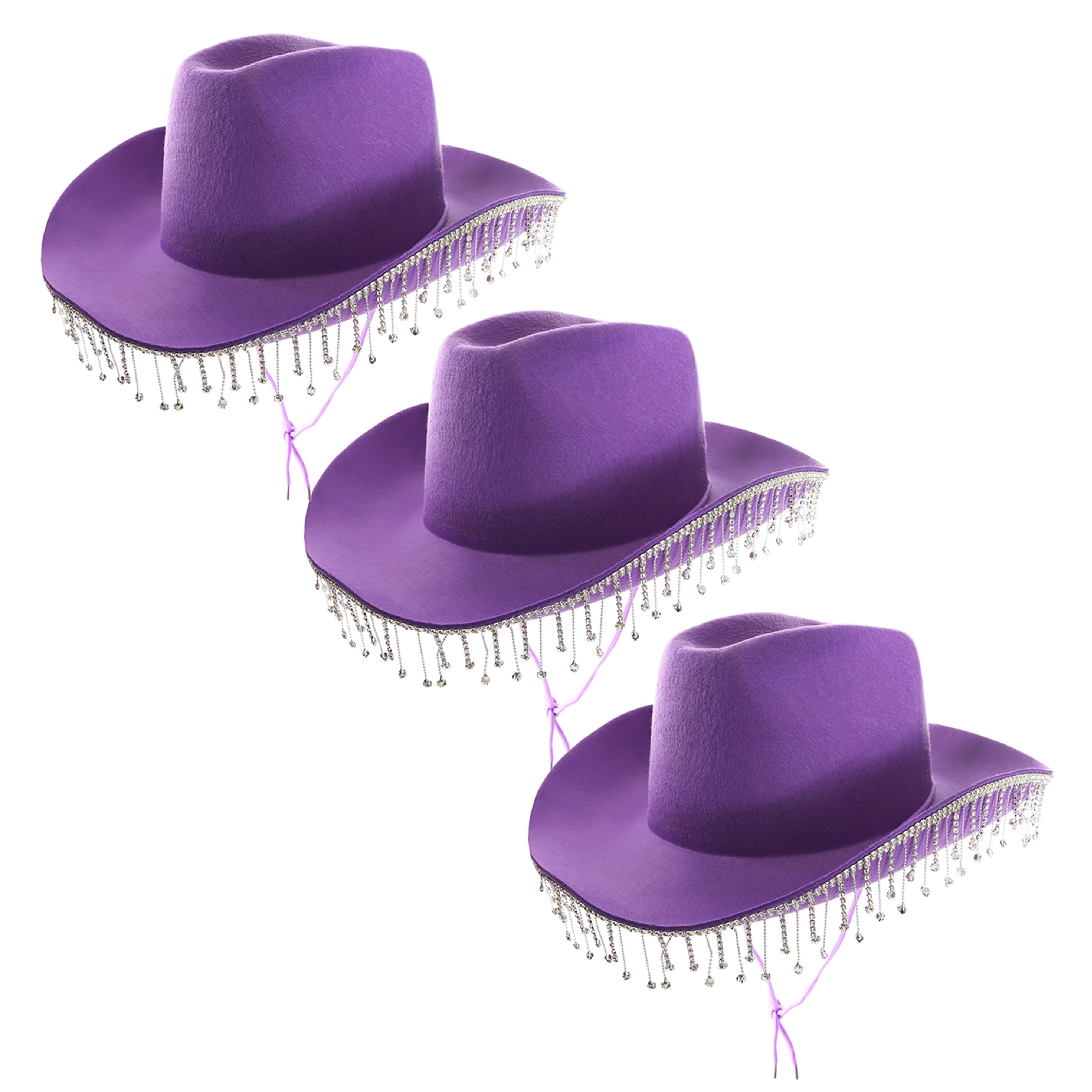 COWBOY HAT DETAILS: This Cowboy Hat is a beautiful Purple colour, with Diamanté detailing around the brim and an adjustable Purple string for extra comfort, the perfect way to finish off your outfit!