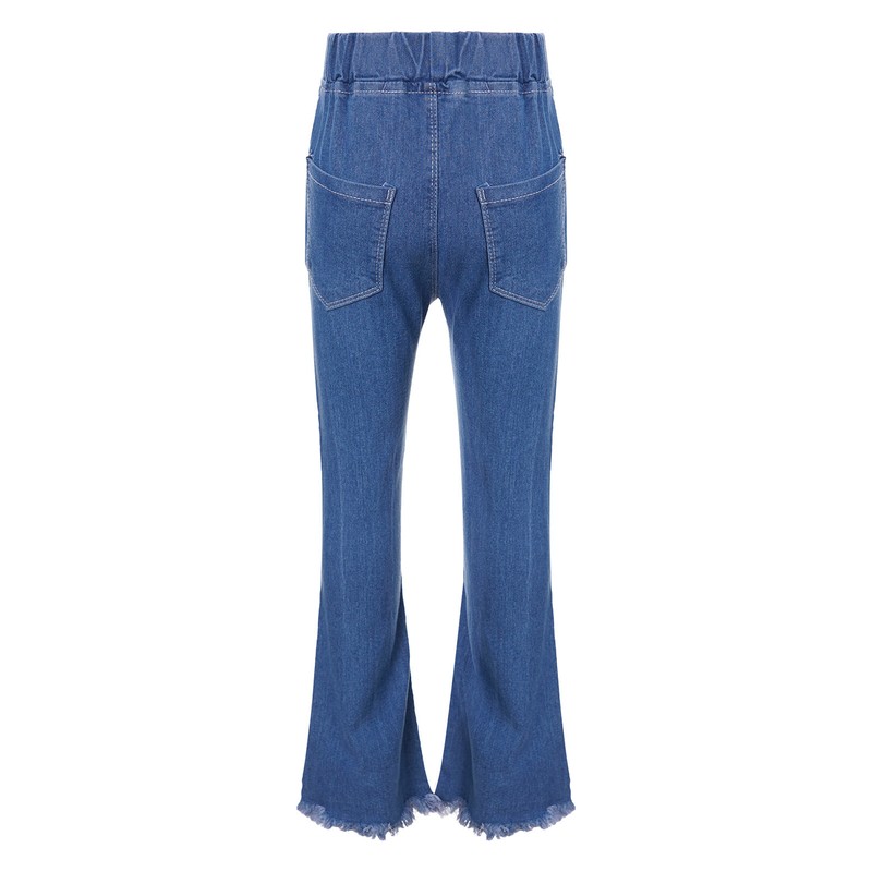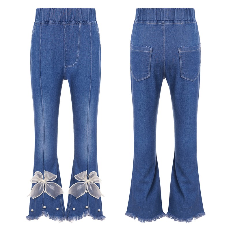 Girl’s high waist flared denim pants with pockets on the back, and the elastic waistband for a better fit.