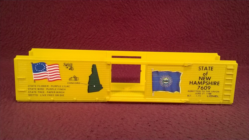 LIONEL 7601-5 BOX CAR BODY - 7609 NEW HAMPSHIRE CAR - SPIRIT '76 Please inspect detailed photos below before buying. The photos show everything that is included. Thanks for the interest!!!!