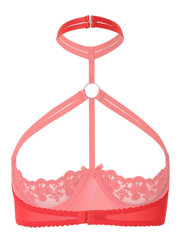 Balconette bra is designed with underwire, 1/3 lace cup, straps and choker connected by O-ring, back 2-row hook&eye closure.