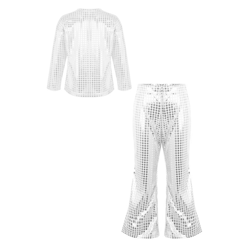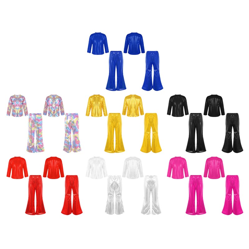 Long sleeve, round neckline tops. Matching with elastic waistband flared pants.