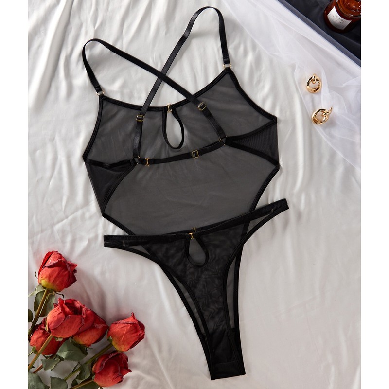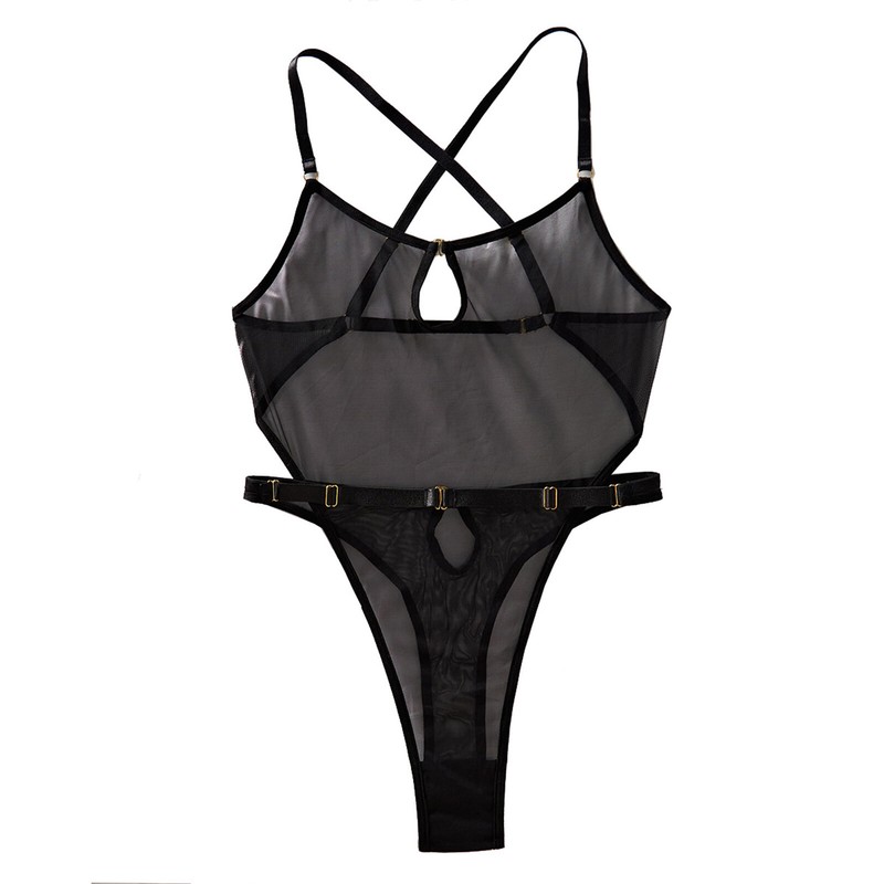 See-through bodysuit designs with adjustable straps crossing at back, front keyhole, backless, high cut, T-back and waist belt.