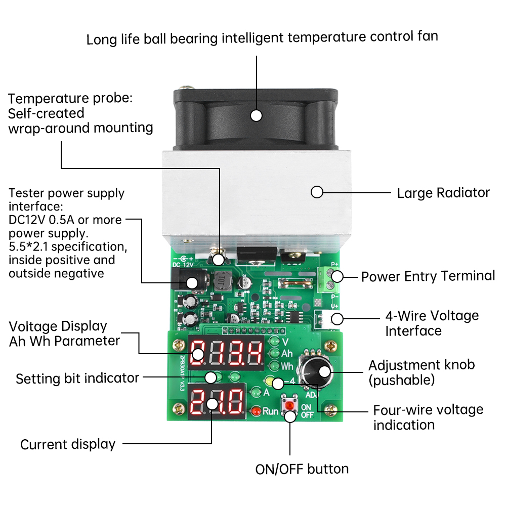 Discharge voltage: 0.90-30.00V (affected by MOS internal resistance and other losses, the measured input 1V can support up to 6-7A current, 9.99A need to be measured voltage greater than 1.3V)