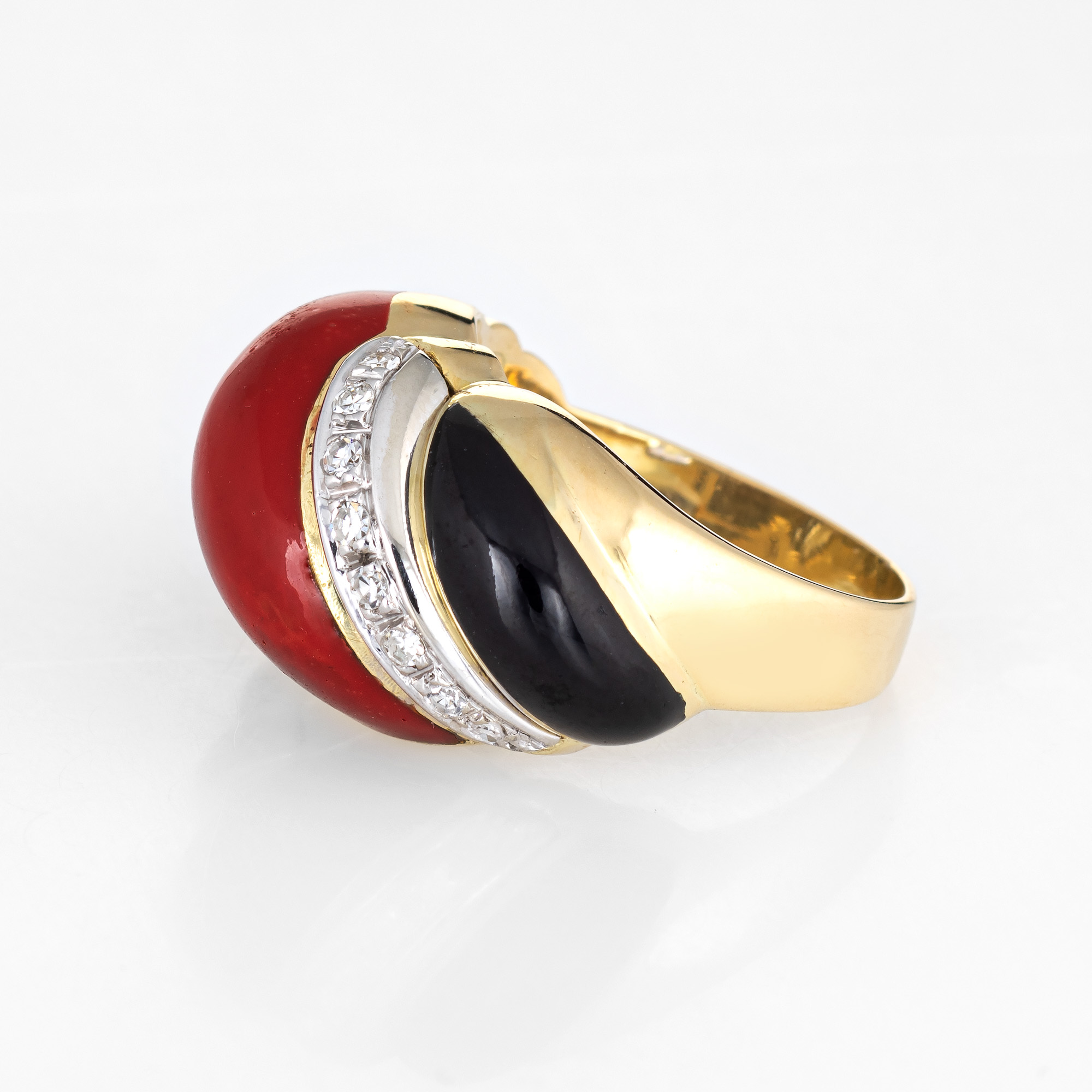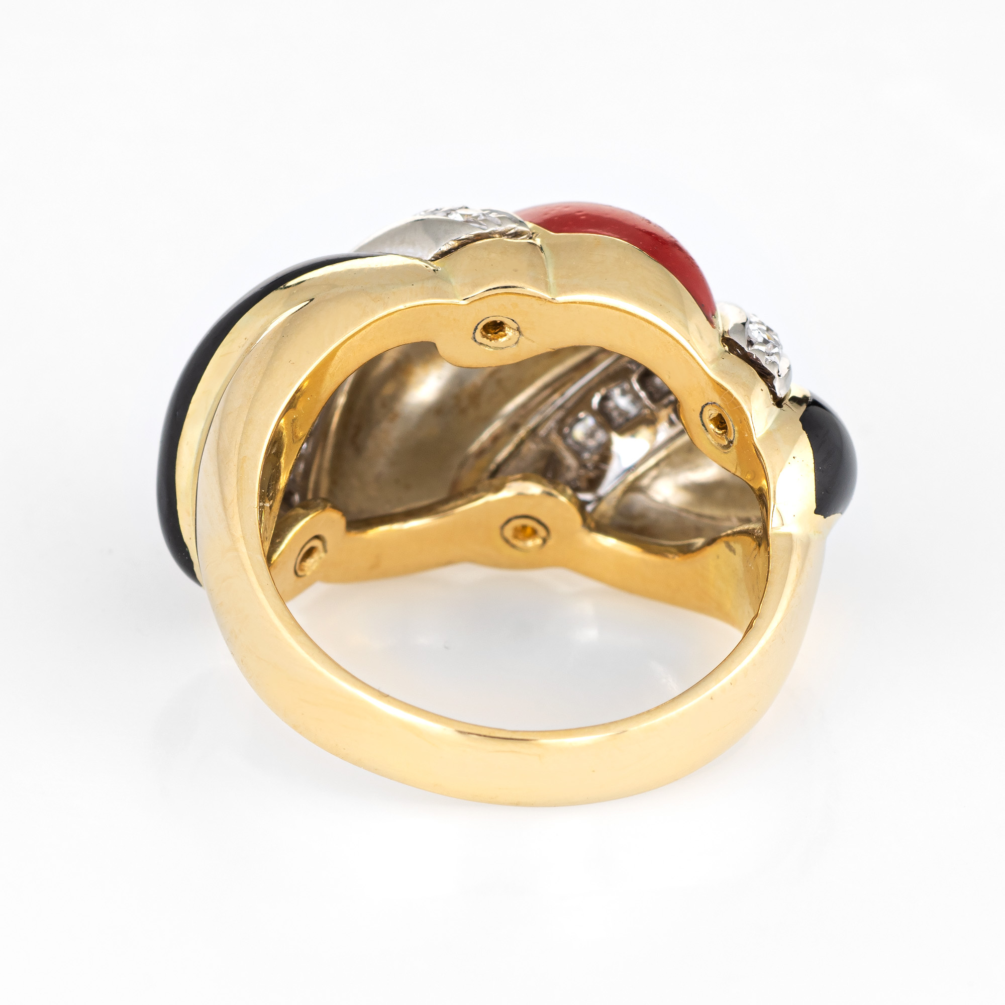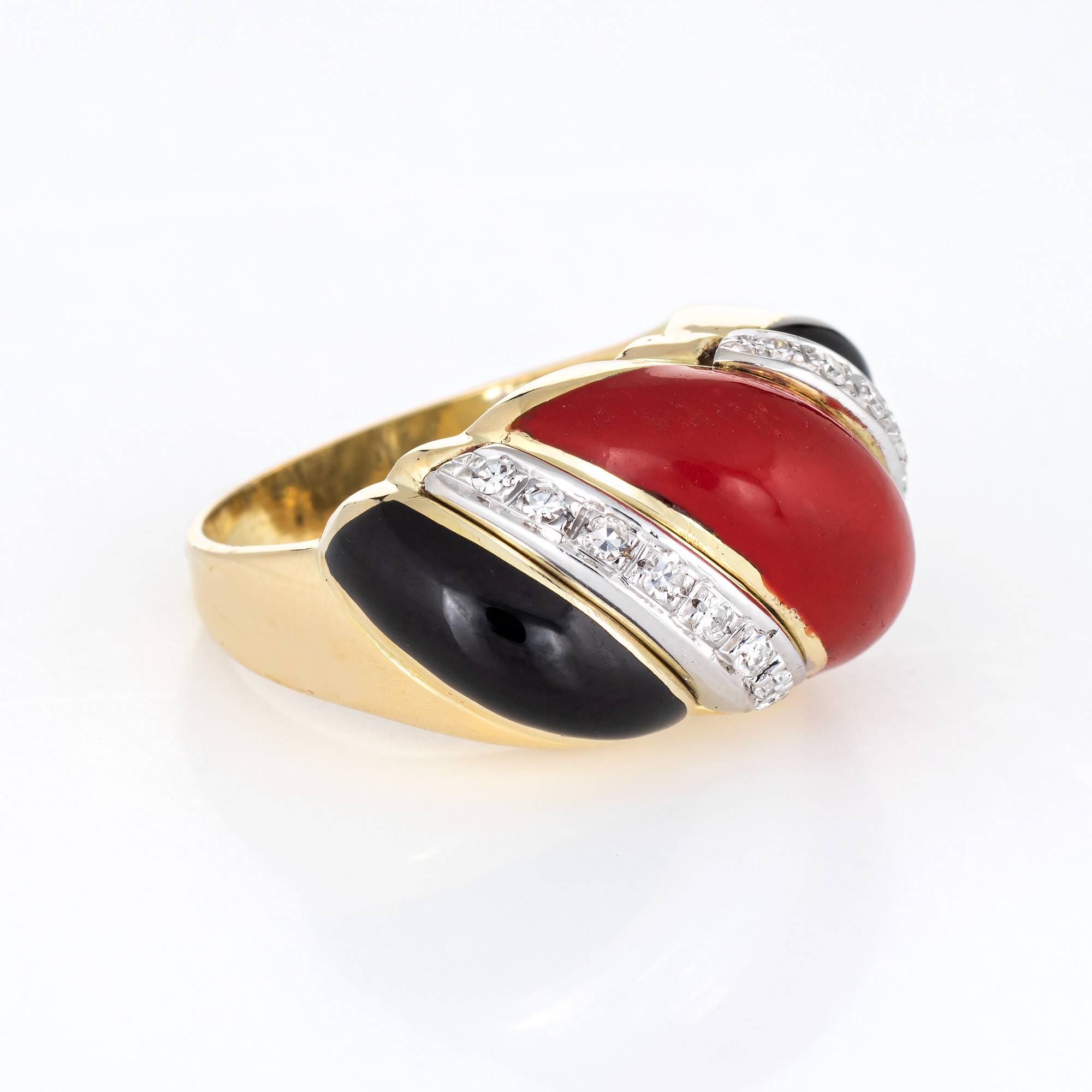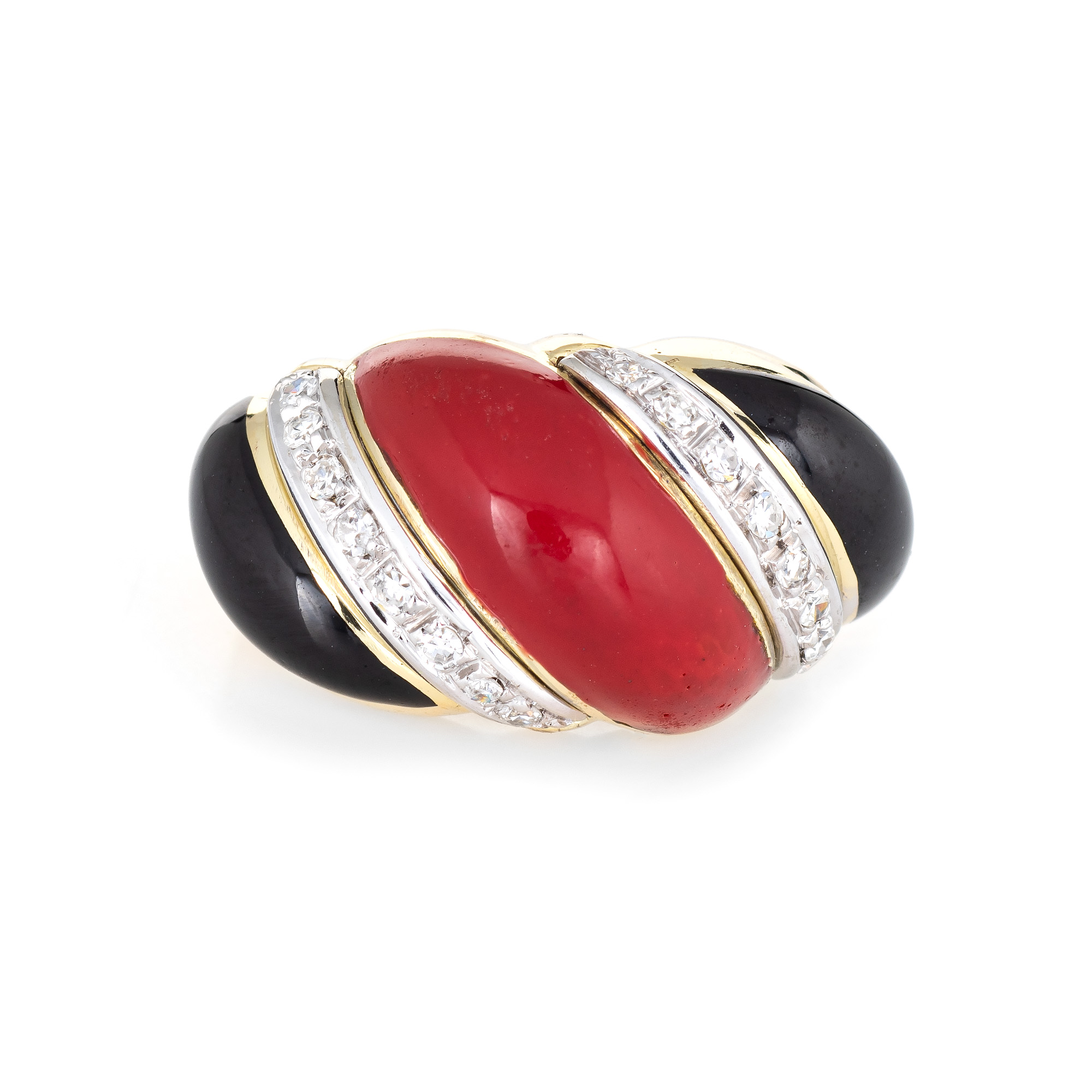 Stylish vintage Sardinian red coral, onyx & diamond cocktail ring (circa 1960s to 1970s) crafted in 18 karat yellow gold.