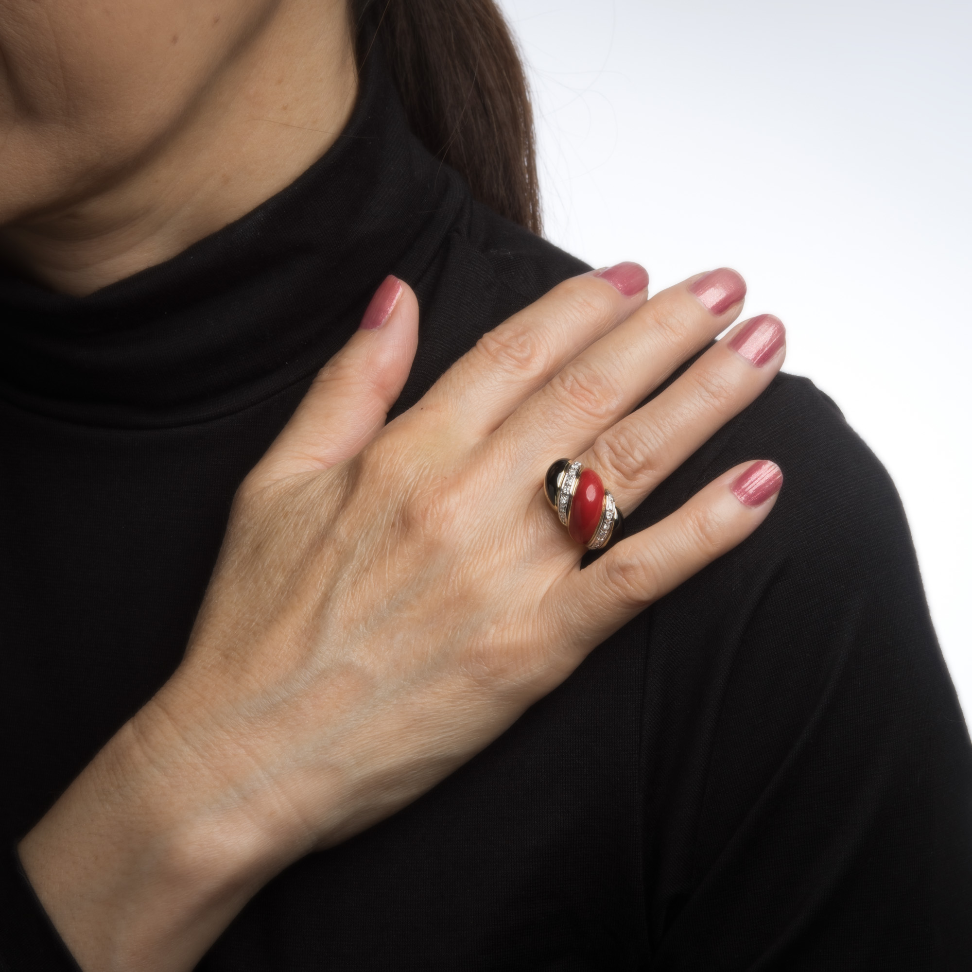 The combination of red coral and onyx is striking and unique. The diamonds are set within the coral and onyx of braided design. The medium rise ring (9mm - 0.35 inches) sits comfortably on the finger.