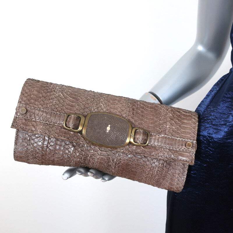 This pre-owned piece from R&Y Augousti blends two distinct exotic leathers — brown snakeskin on the body with stingray accents — creating a tactile, high-impact look that works equally well for black-tie evenings or elevated cocktail hours.