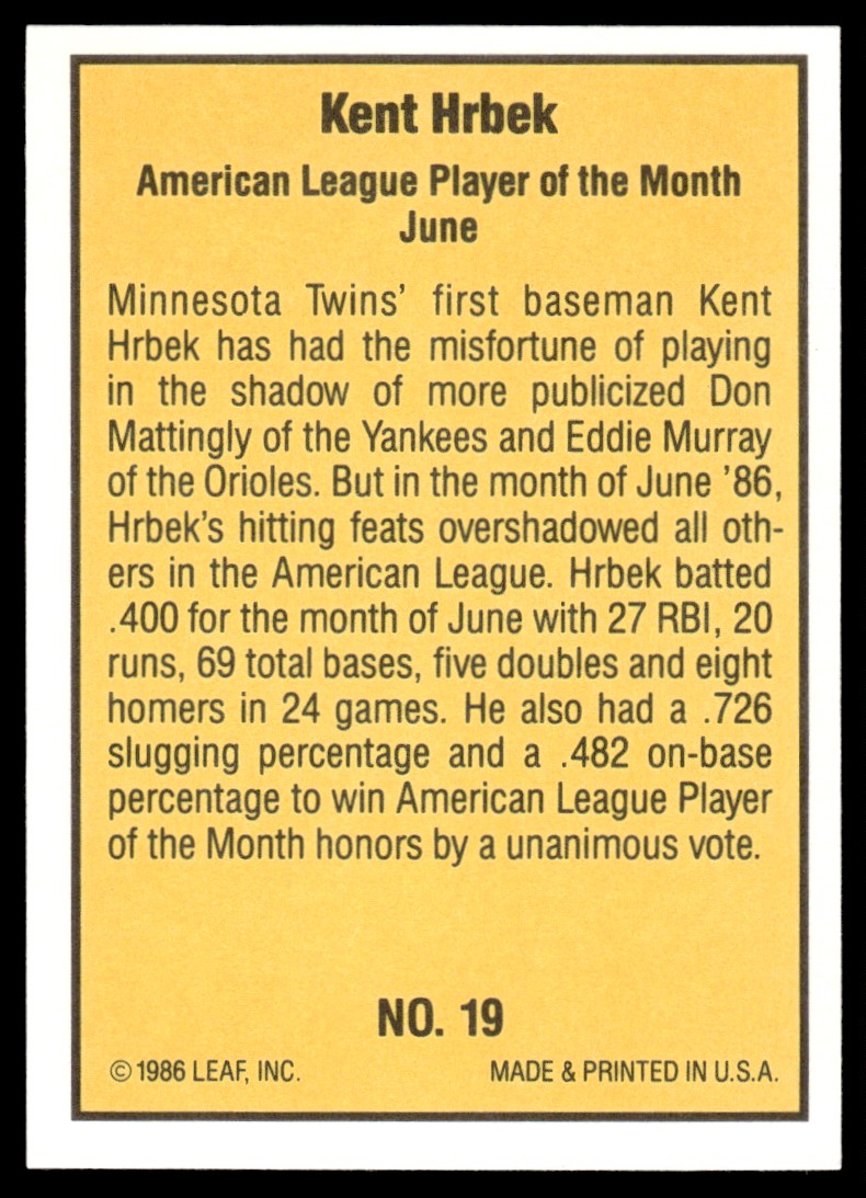 | 1986 Donruss Highlights KENT HRBEK #19 Minnesota Twins | ||||||||||||||||
